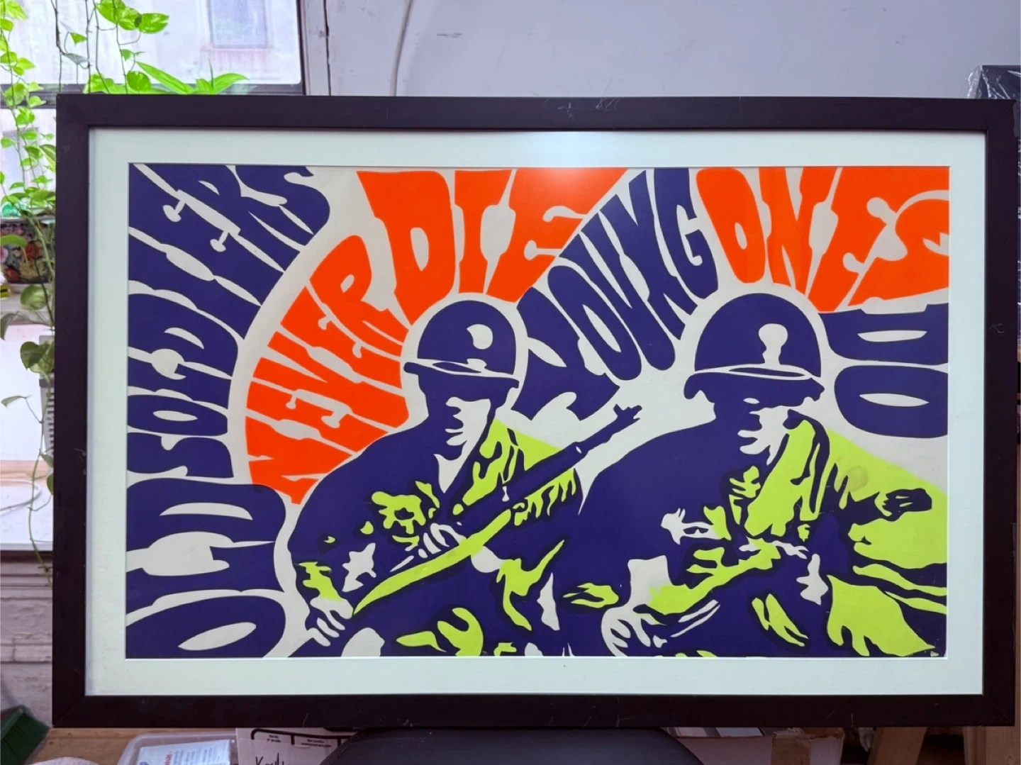 Here's a framed 1968 vintage pop art print featuring the phrase "Old Soldiers Never Die Young Ones Do" with a graphic of soldiers. The frame is black. It's a unique piece that could add some character to your space