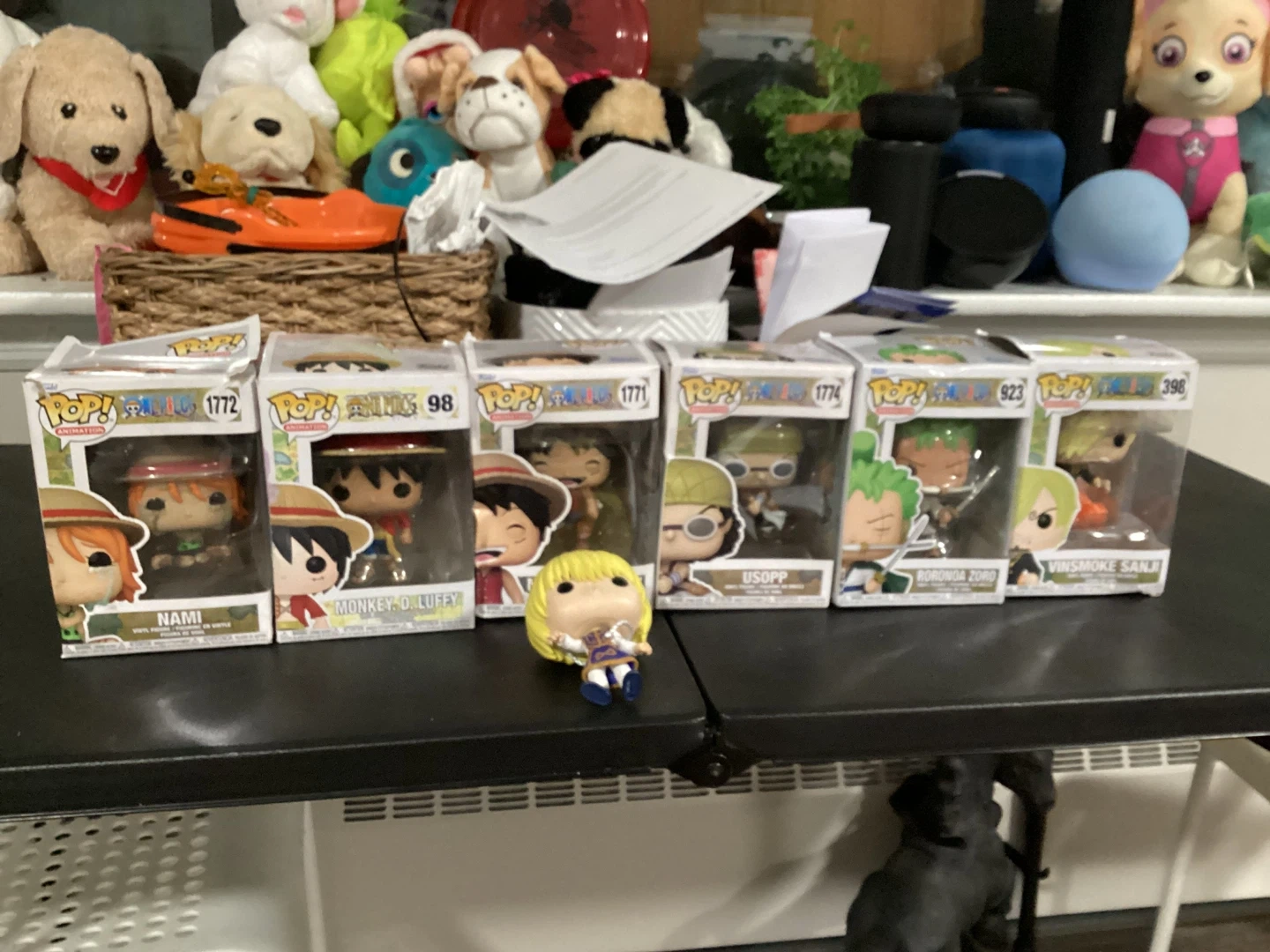 Selling a collection of One Piece Funko Pop! figures. Includes Nami (1772), Monkey D. Luffy (98), Usopp (1771), Roronoa Zoro (923), and Vinsmoke Sanji (398). All figures are in their original boxes!