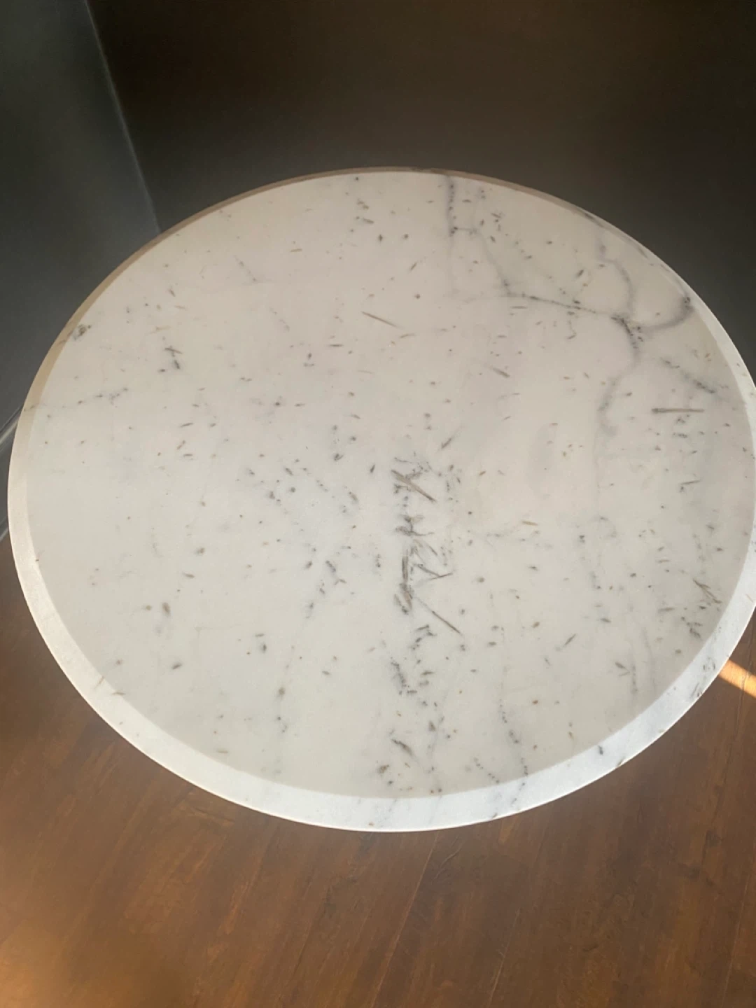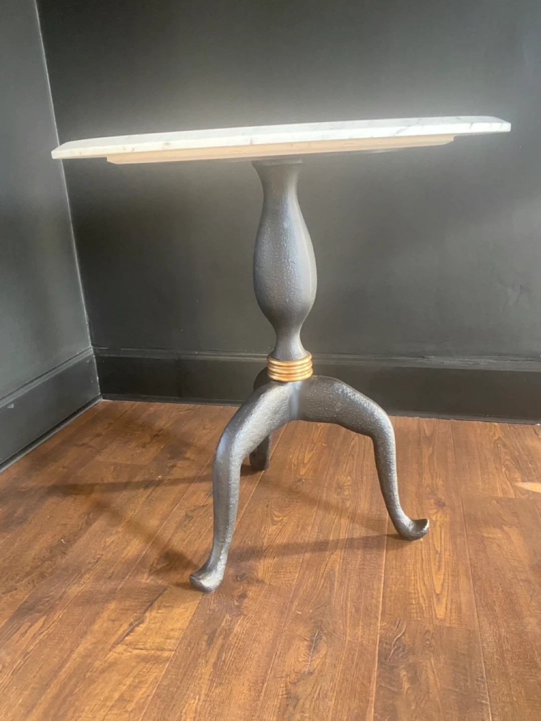 This is a unique side table with a marble top and a black finish. It has a distinctive design with three legs and a gold accent ring. It would be a great addition to any room!