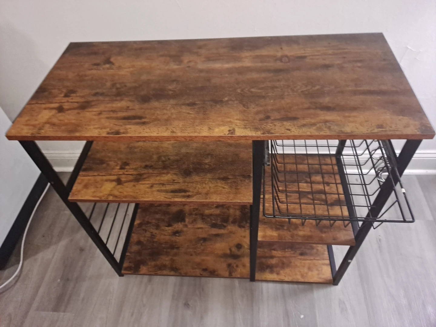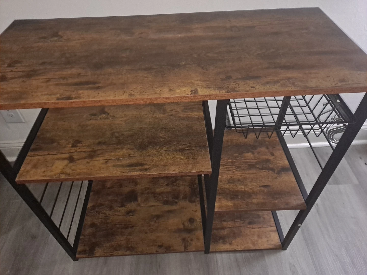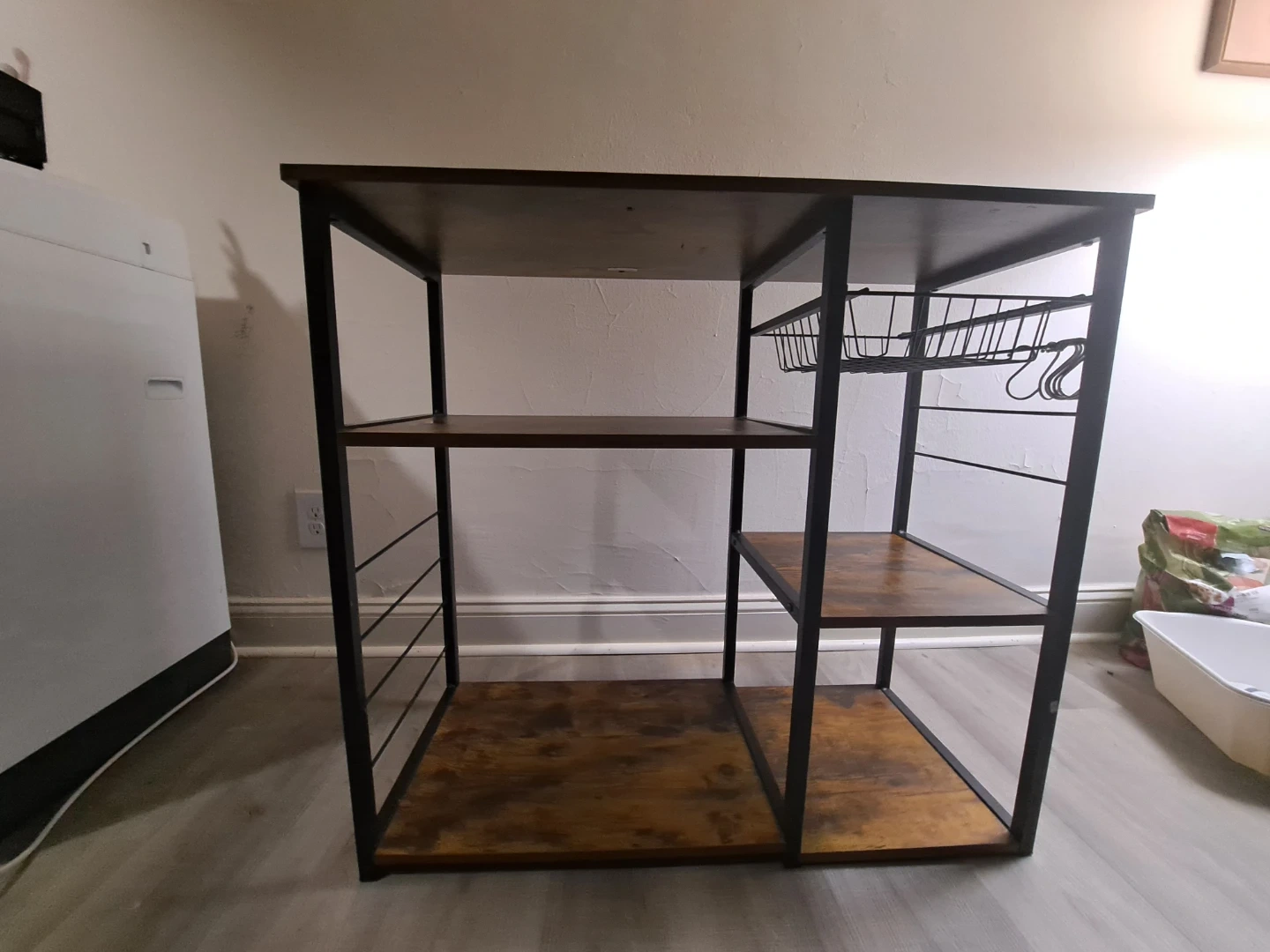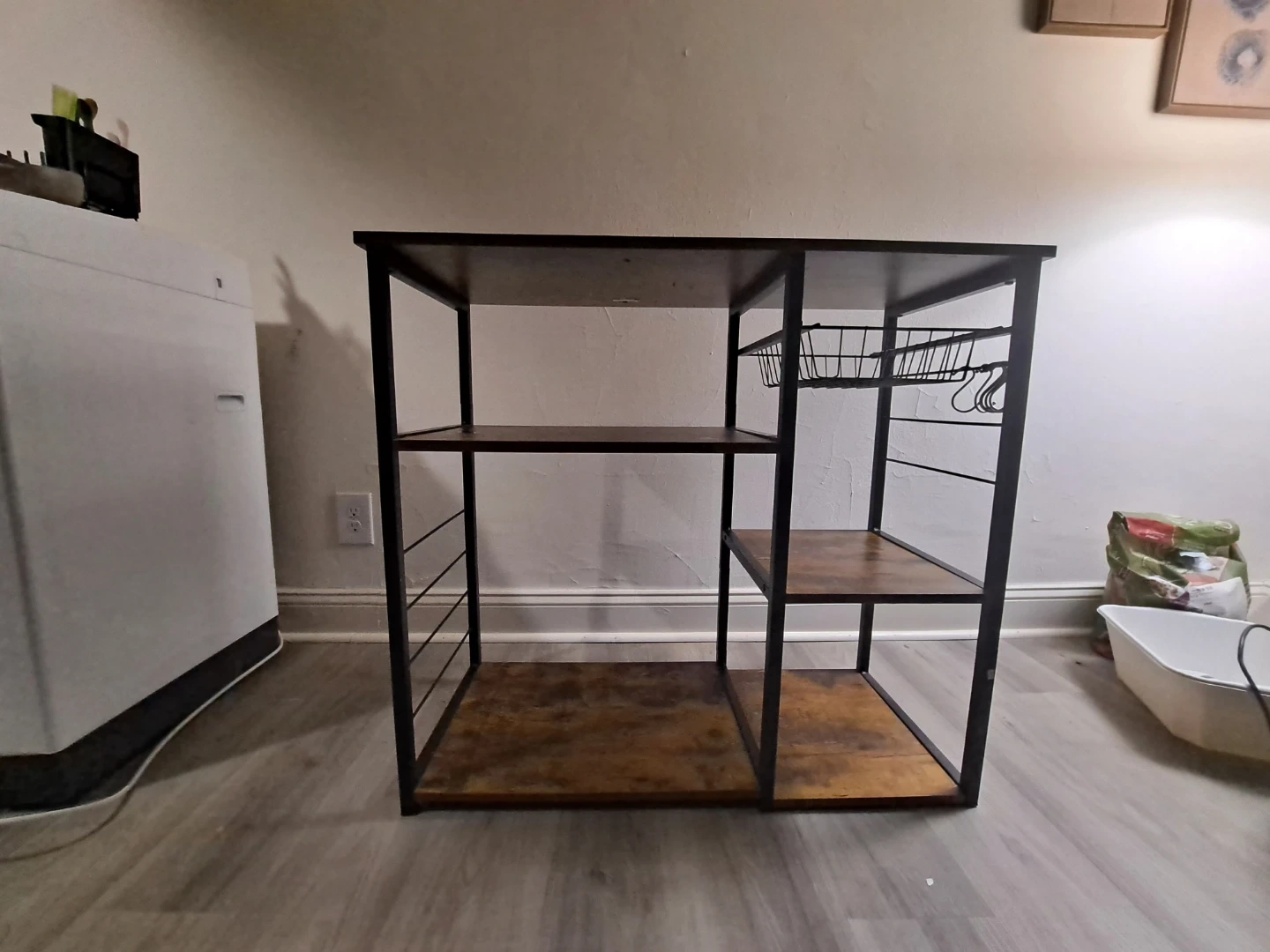 This is a kitchen baker's rack with a metal frame and wooden shelves. It features a basket for storage and hooks for hanging items. Great for adding extra storage to your kitchen!
