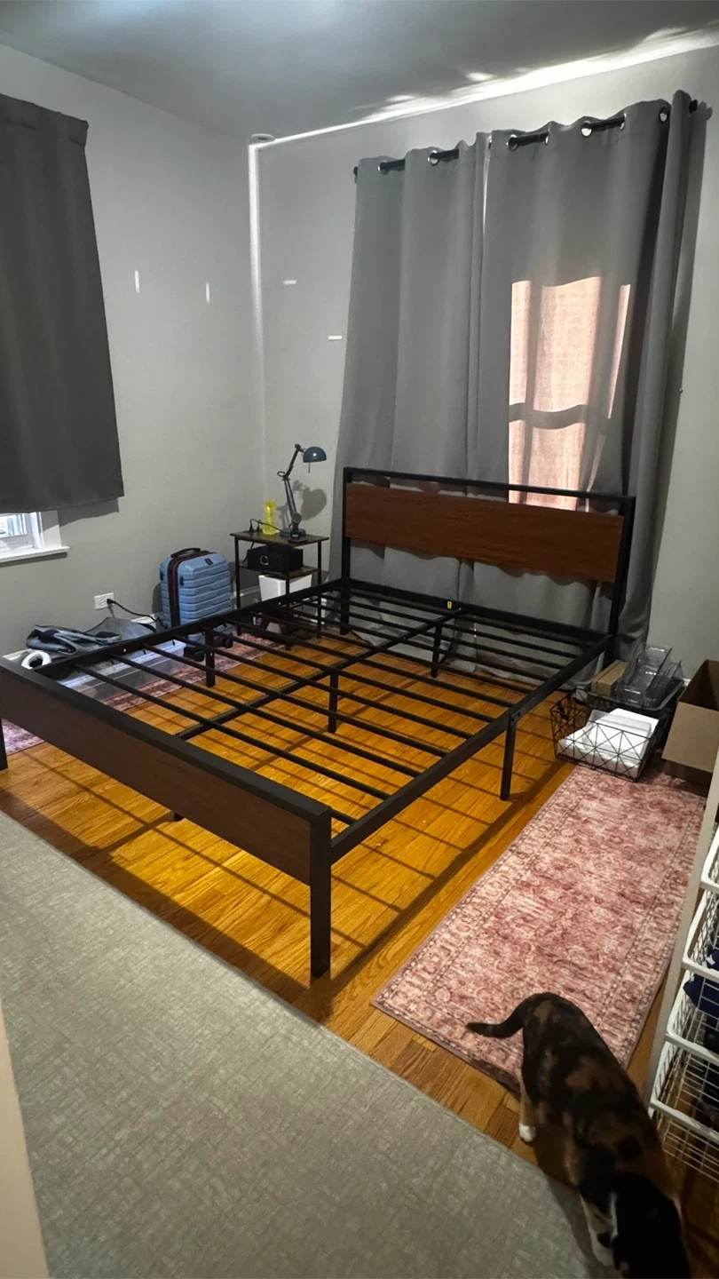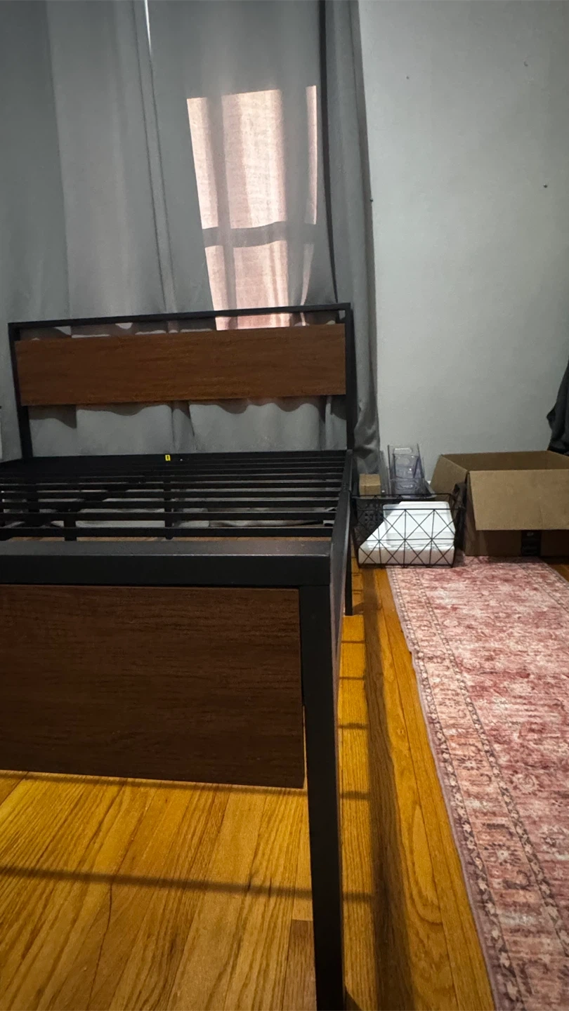 107Selling a full-size metal bed frame featuring a wood headboard. The frame is sturdy and in good condition. It's a simple and stylish design that would look great in any bedroom! Easy to assemble and disassemble. Size: Queen. Does not need box spring for mattresses. Original listing: https://a.co/d/7ITg8aB