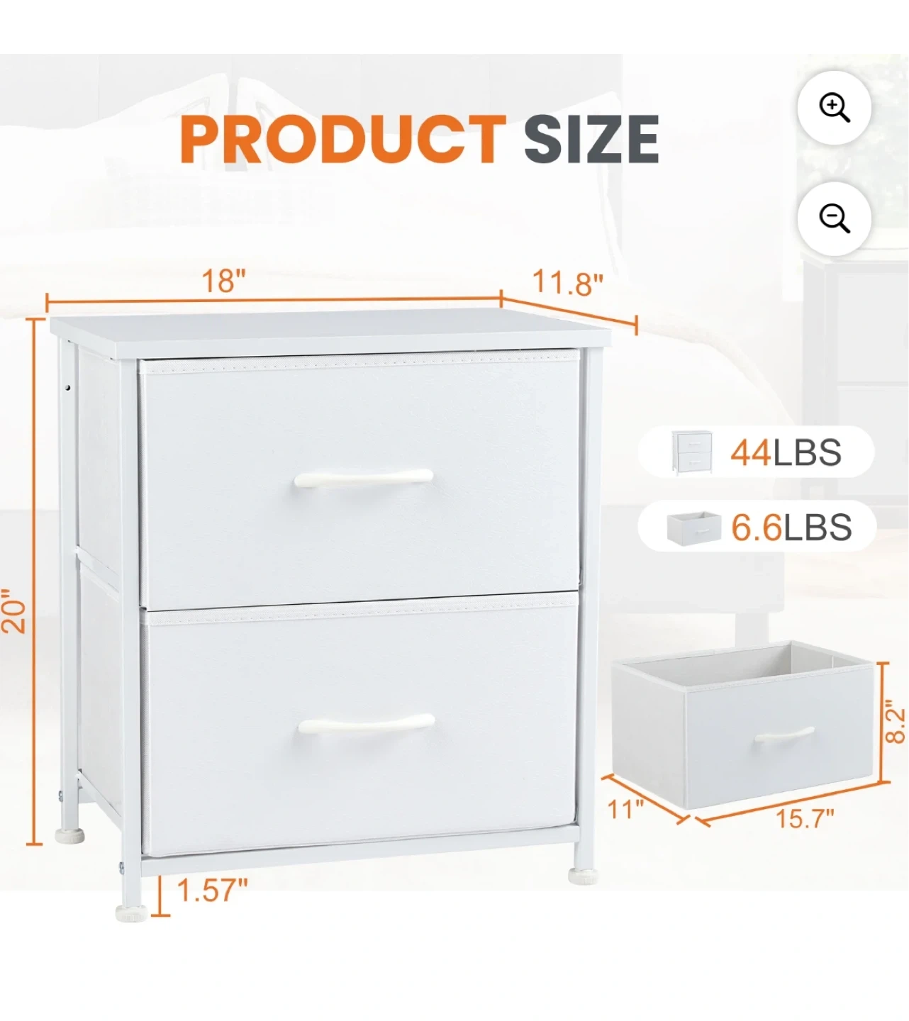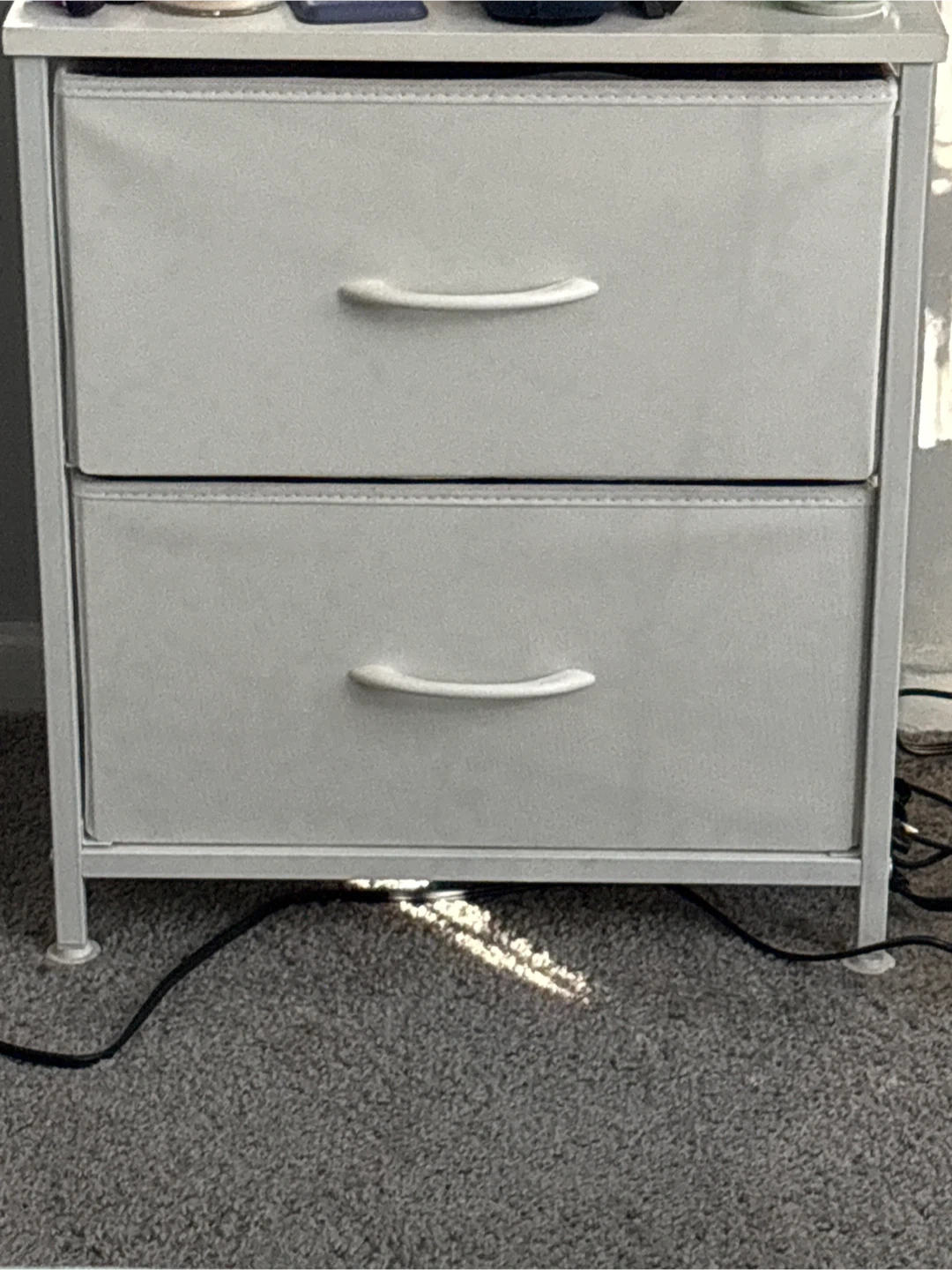 Selling a cute 2-drawer nightstand! It's a fabric dresser with a simple design. The dimensions are approximately 20" tall, 18" wide, and 11.8" deep. Perfect for adding some extra storage to your bedroom or living space