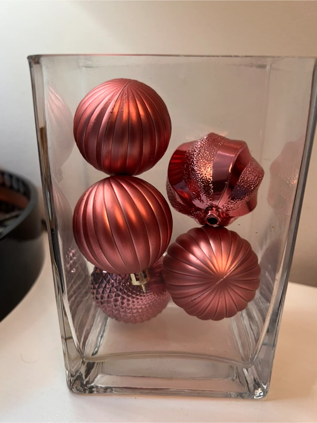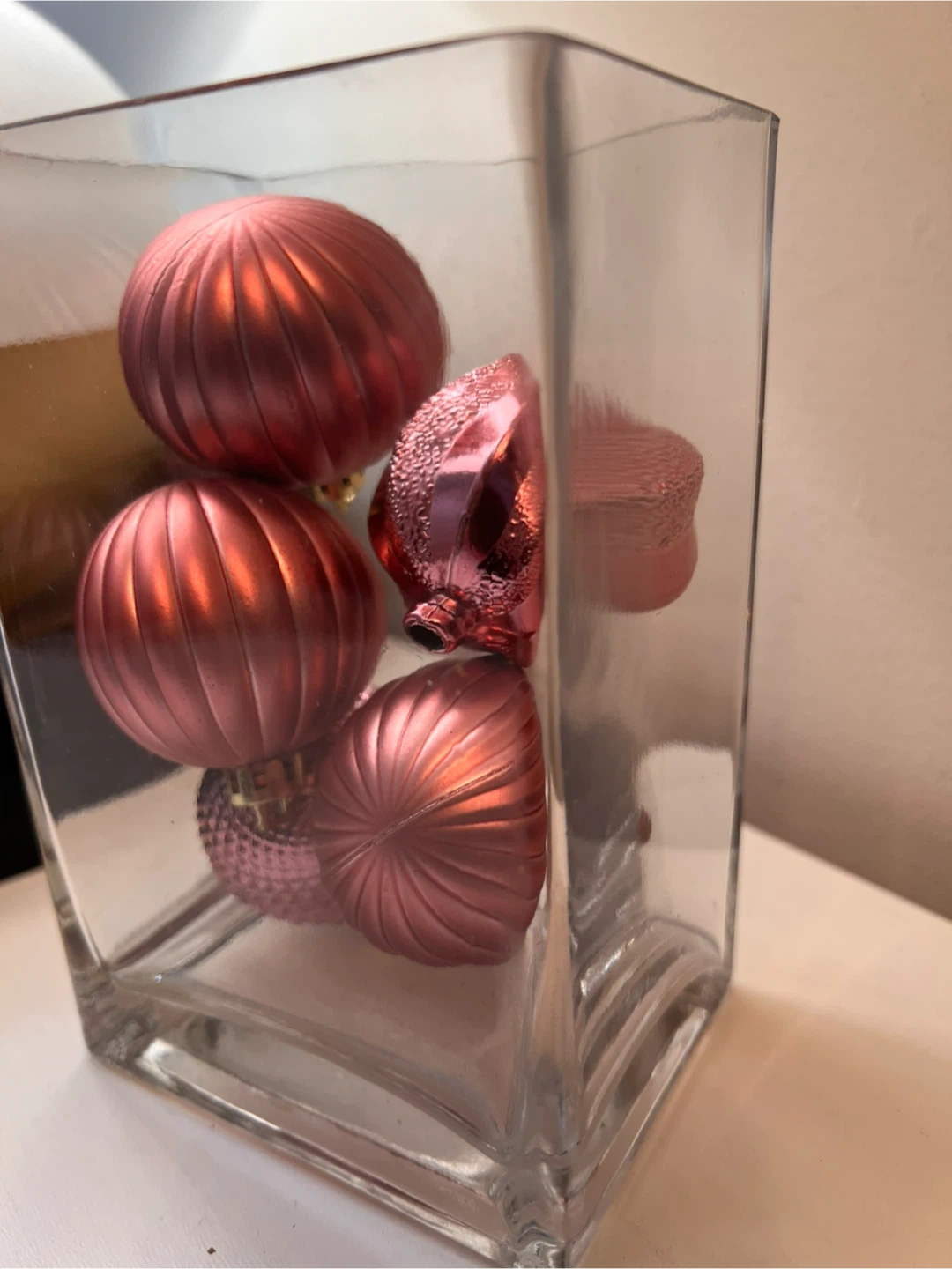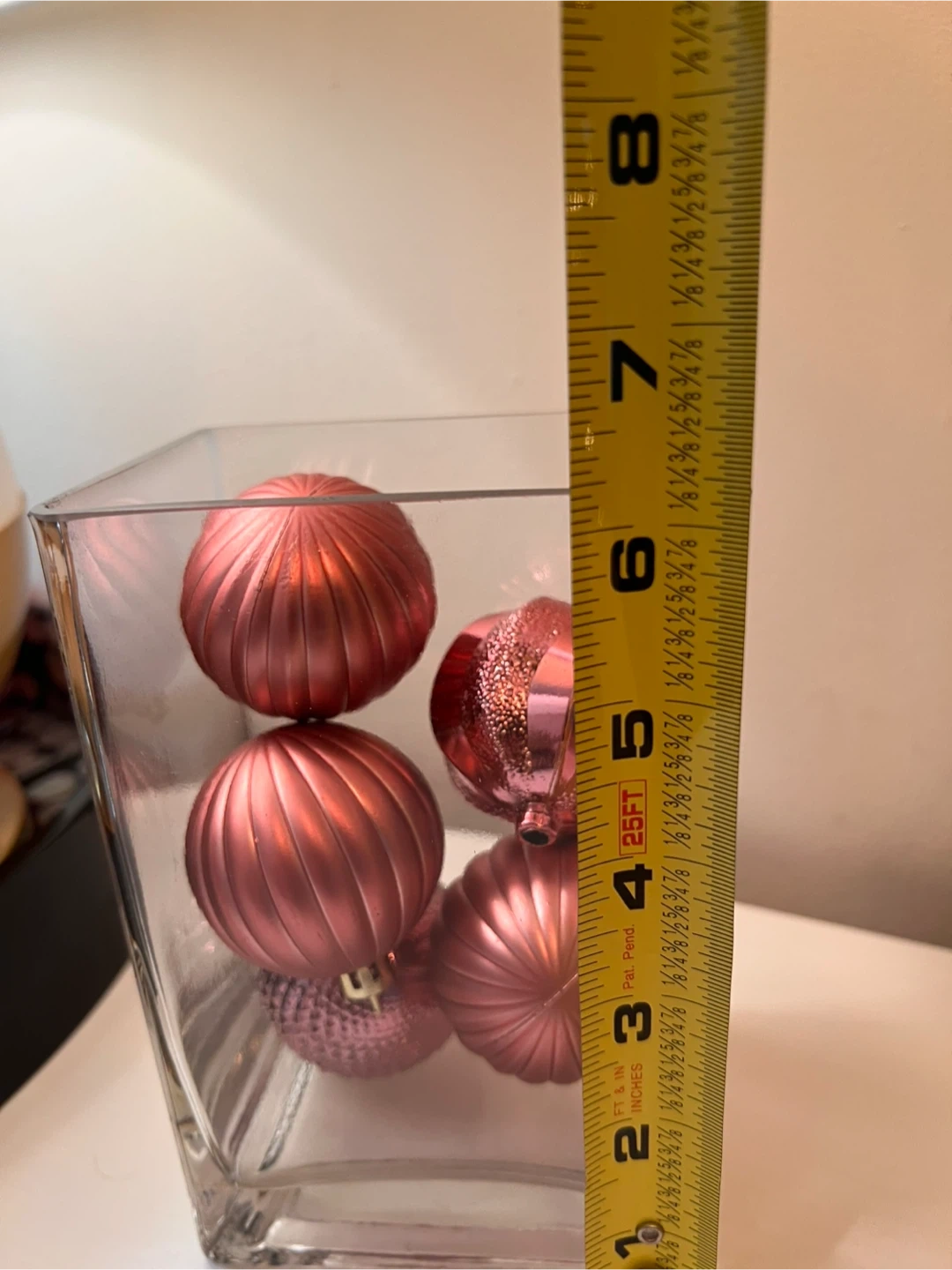 45Hand Crafted Crafted: Selling a clear glass vase filled with pink ornaments! The vase measures approximately 4 inches across. Perfect for adding a touch of color to your home decor