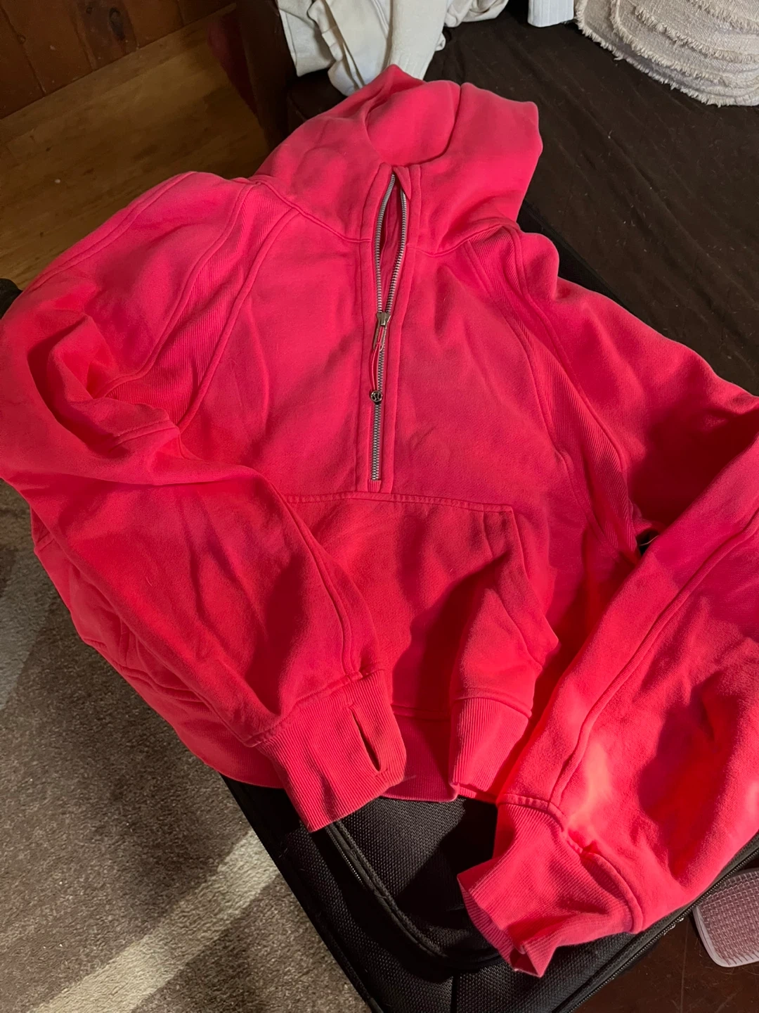 I'm selling a Lululemon half-zip hoodie in a vibrant pink color! It's in great condition and perfect for workouts or casual wear. It features a convenient half-zip design and thumbholes for added comfort and functionality