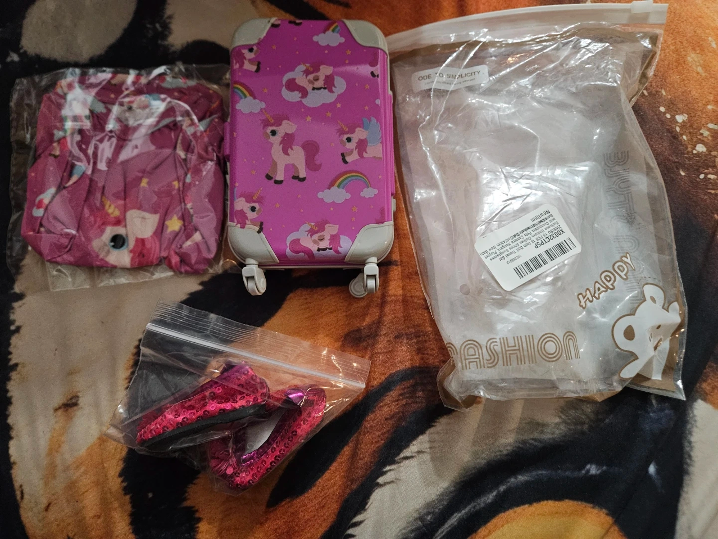 This doll travel set includes a suitcase, clothes, shoes, sunglasses, computers, pets, a camera, hangers, and other accessories! It's designed for an 18-inch doll or a 43cm new baby doll. The set features a cute unicorn theme and is in new condition.
