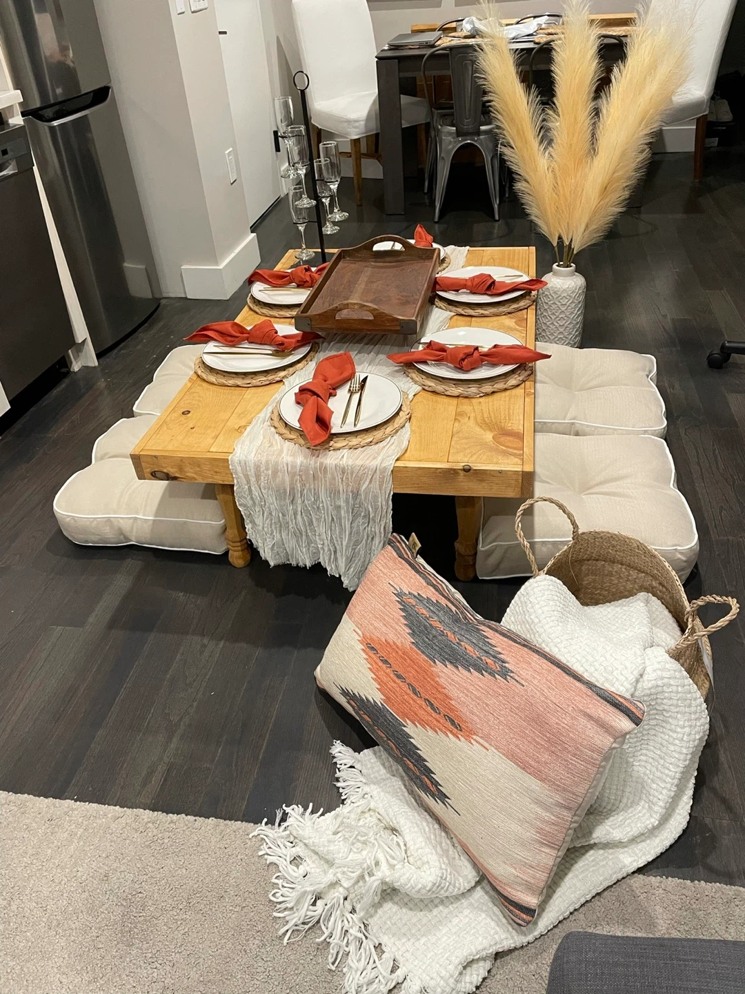 Selling 2 beautiful low picnic tables with cushions. This set is perfect for creating a cozy and inviting space for picnic parties. It includes 2 wooden tables and 8 comfortable cushions for seating around it. Great for casual gatherings or adding a unique touch to your home!