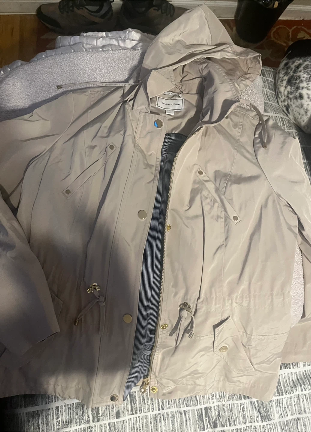I'm selling a Charter Club hooded rain jacket in a neutral beige color. It's lightweight and perfect for spring or fall weather. The jacket features a zip-up front with button closures and several pockets. The inside is lined with a striped pattern. It's in great condition!