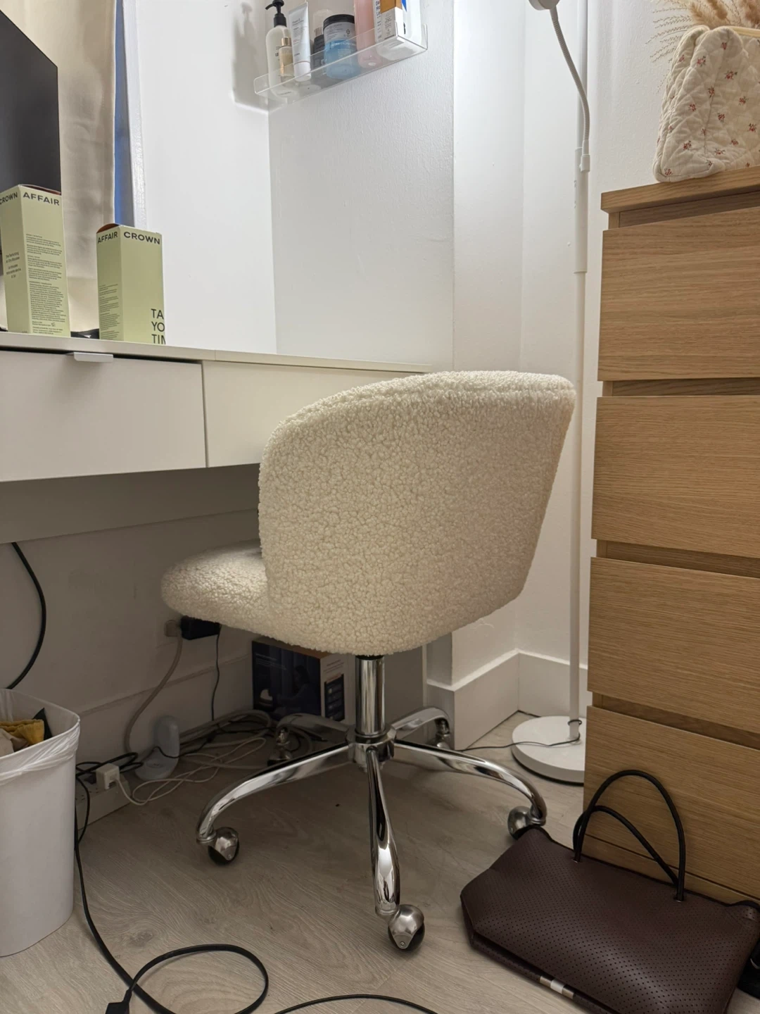 I'm selling a super cute and comfy boucle swivel desk chair! The boucle upholstery is extra soft, and the thick padding provides great comfort and support. It’s easy to adjust the chair to fit any desk or vanity. Plus, the 360-degree swivel function makes multitasking a breeze!