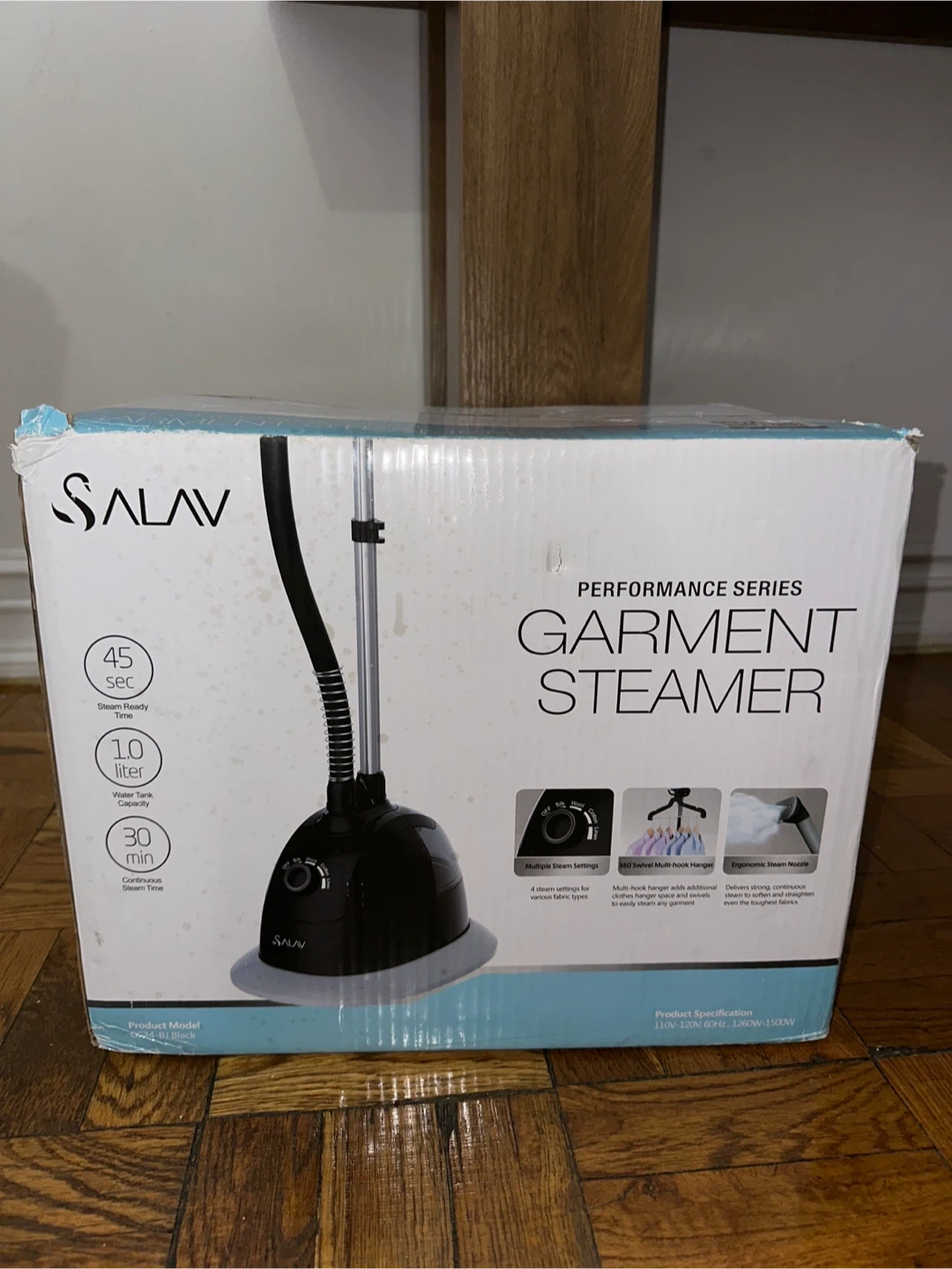 Selling a brand new Salav Performance Series Garment Steamer! It has a 1.0 liter water tank capacity, providing 30 minutes of continuous steam time. It's ready to steam in just 45 seconds! The steamer has multiple steam settings for various fabric types, a 360 swivel multi-hook hanger, and an ergonomic steam nozzle. Box never opened