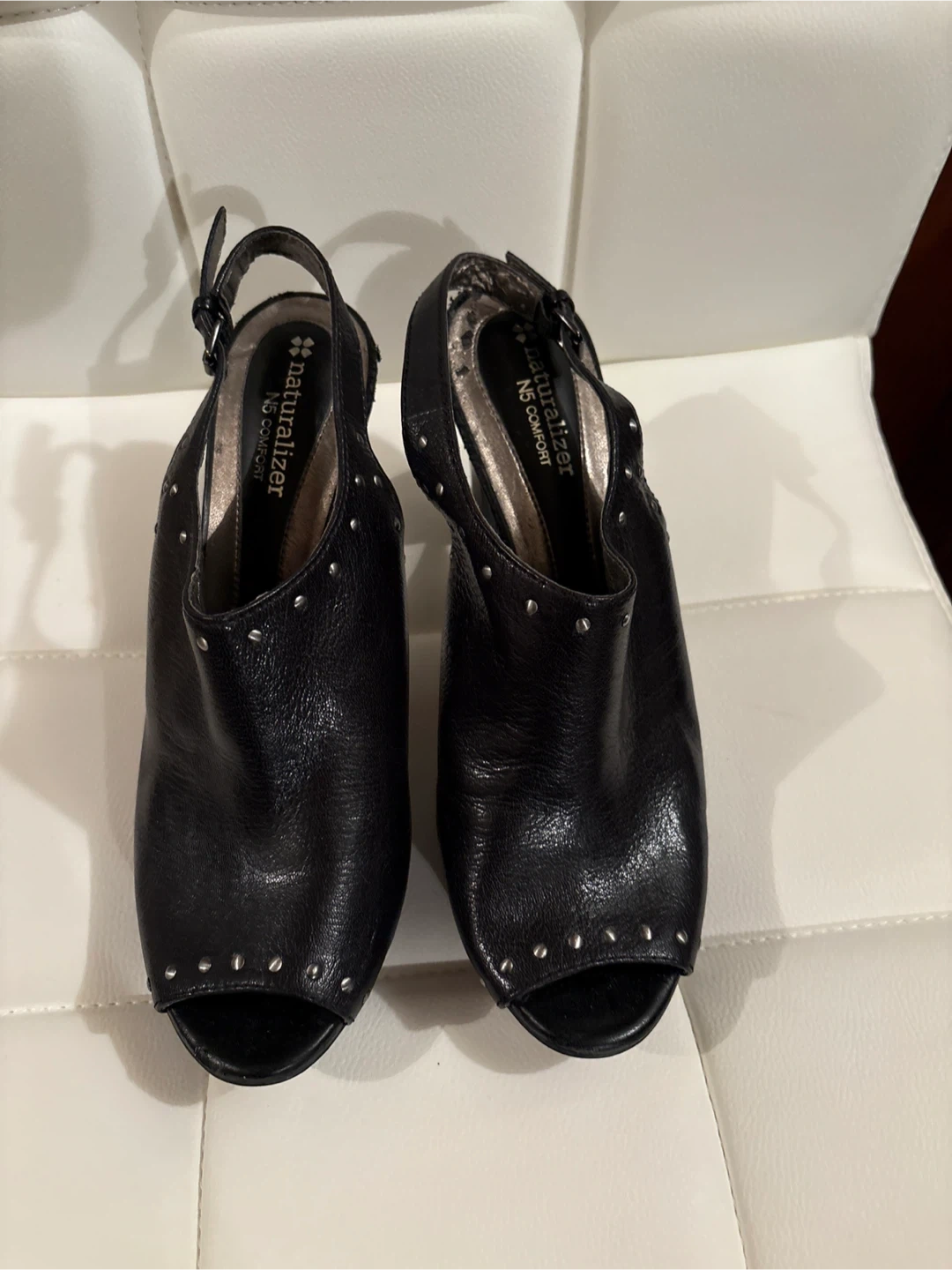 Selling a pair of Naturalizer black leather heels in size 8.5. They show some wear and tear, as you can see in the photos, but they still have lots of life left!