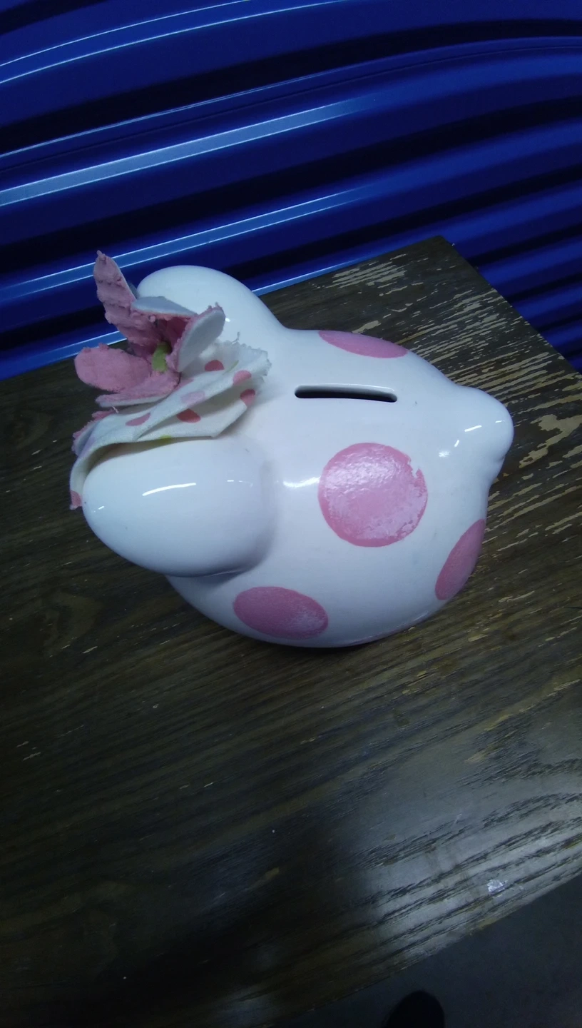 1000+Cute piggy bank with pink polka dots and a flower on its head! It's in good condition and ready to help you save your pennies