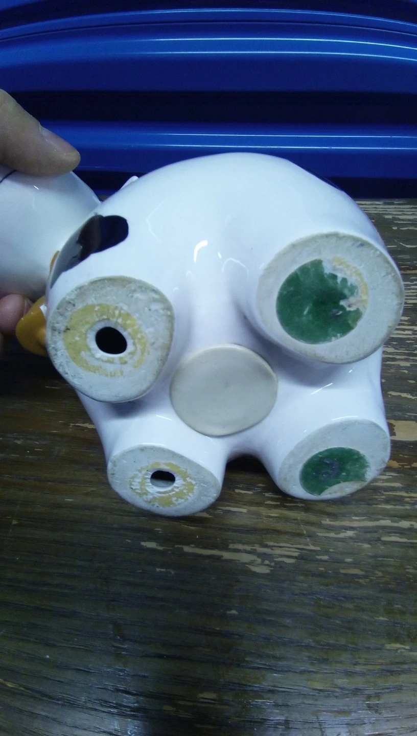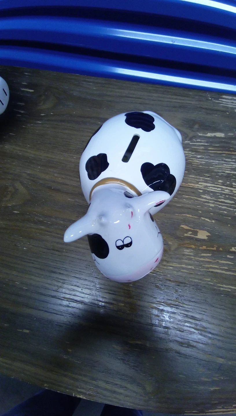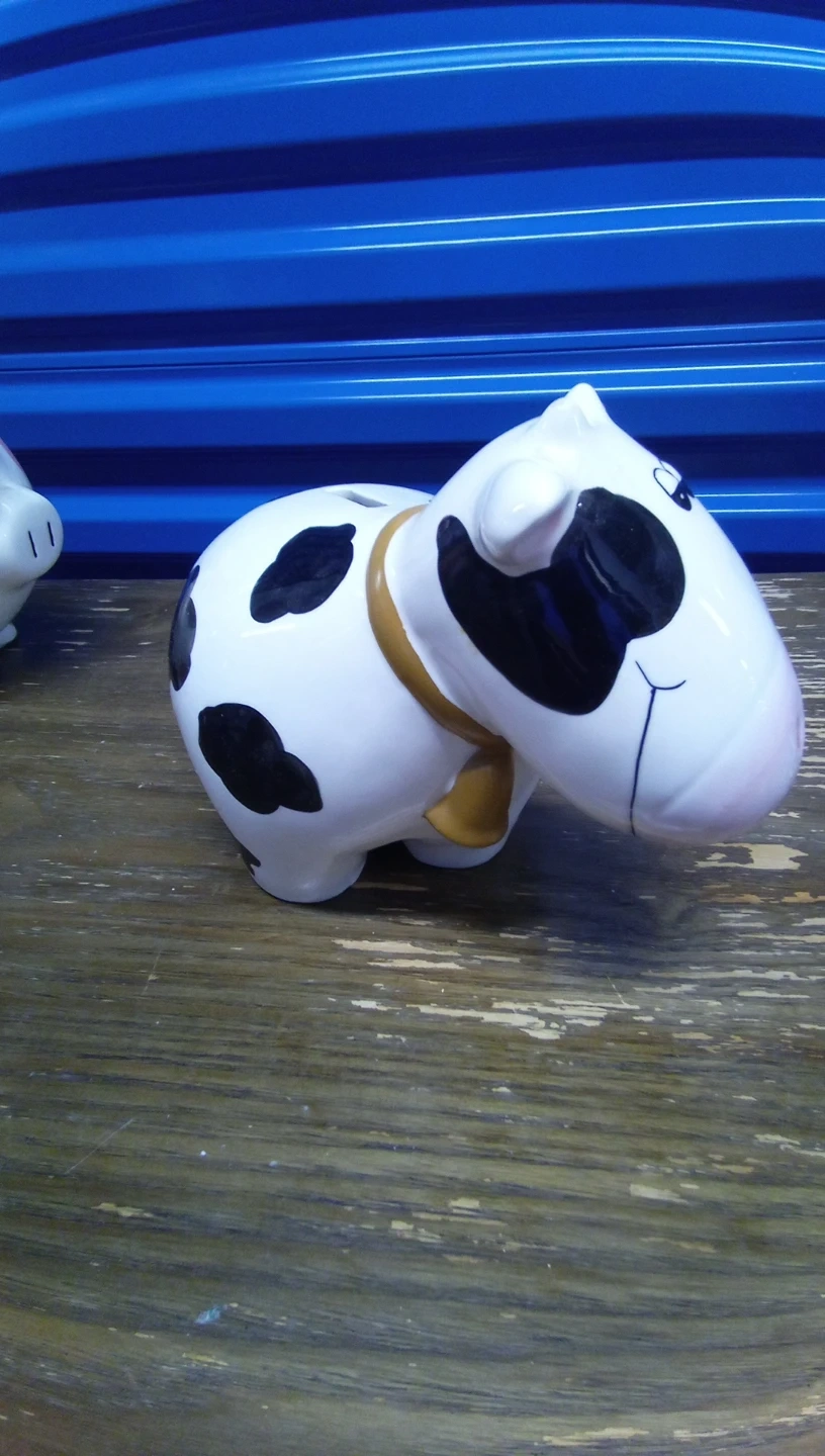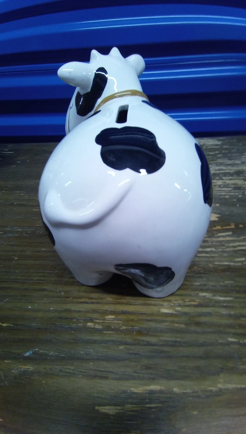 1000+Here's a cute cow piggy bank! It's white with black spots and has a slot on its back for coins
