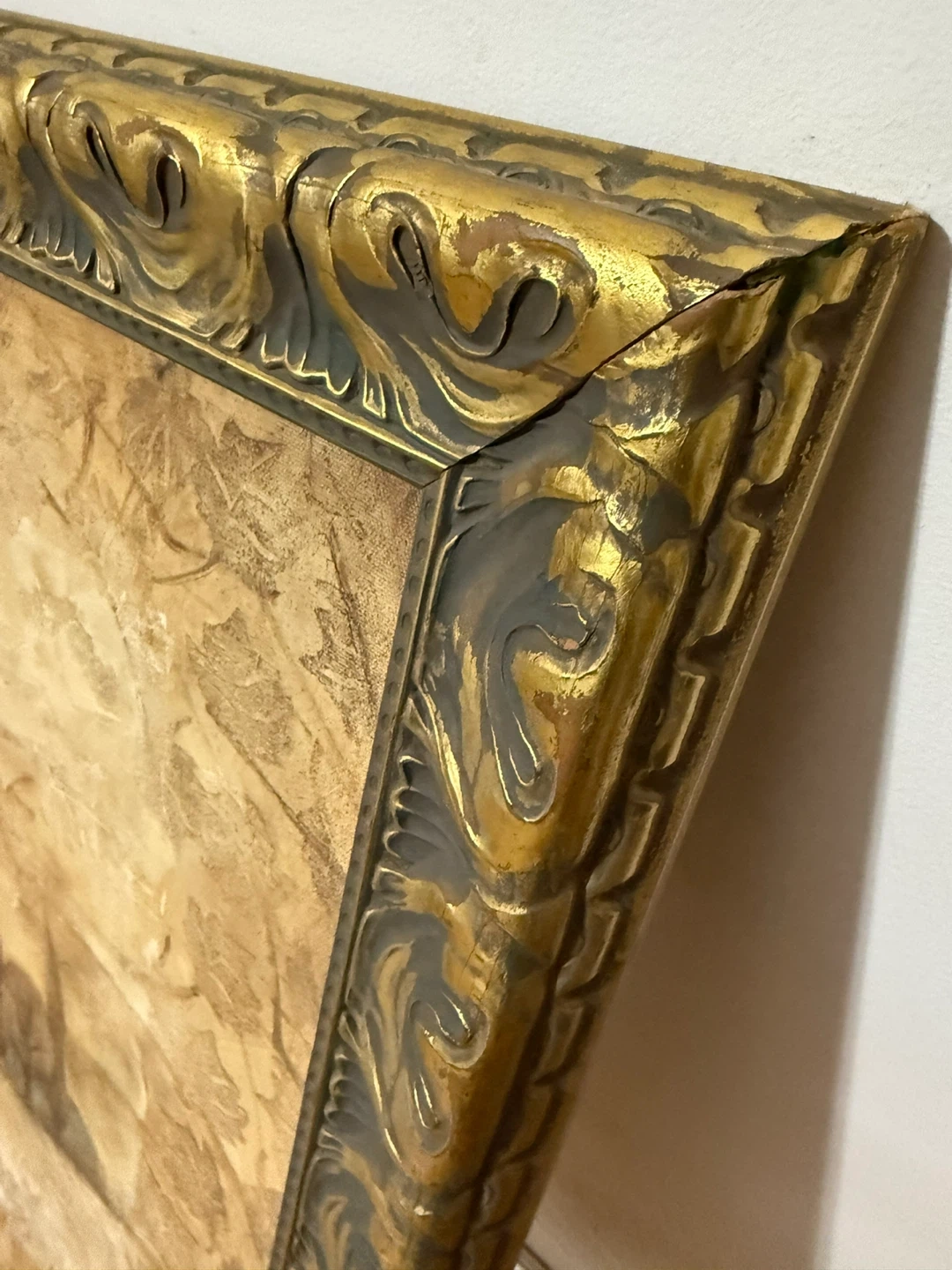 Beautiful framed wall art depicting a Tuscan landscape. The frame has an ornate gold and dark gray design. It's in great condition and ready to bring a touch of Italian countryside charm to your home