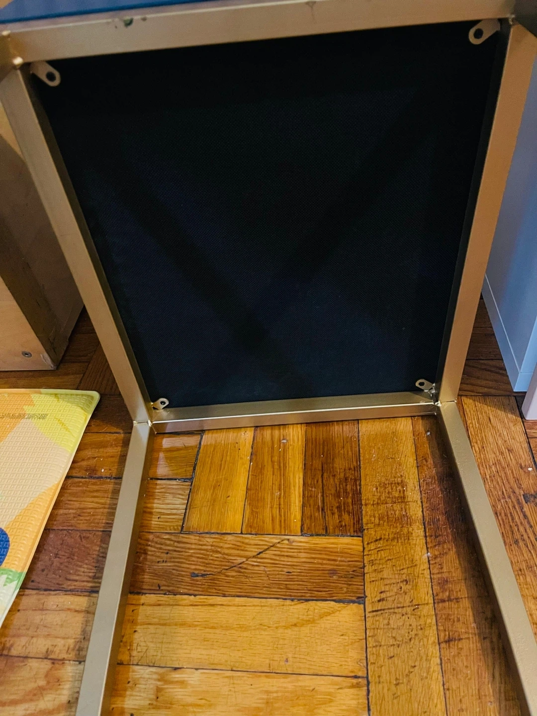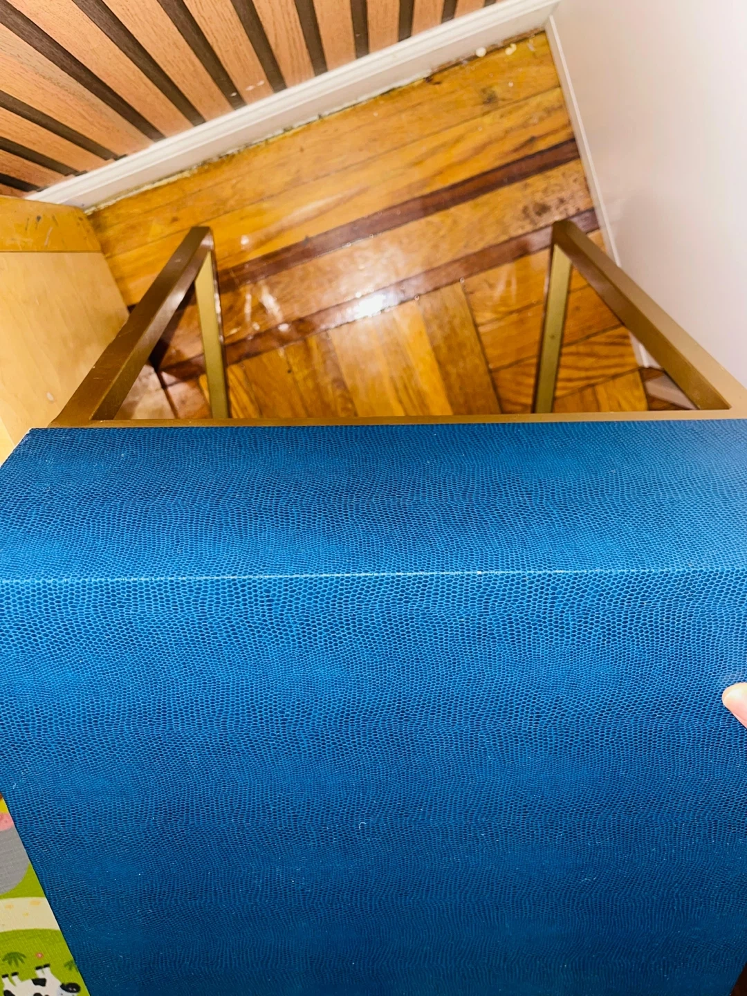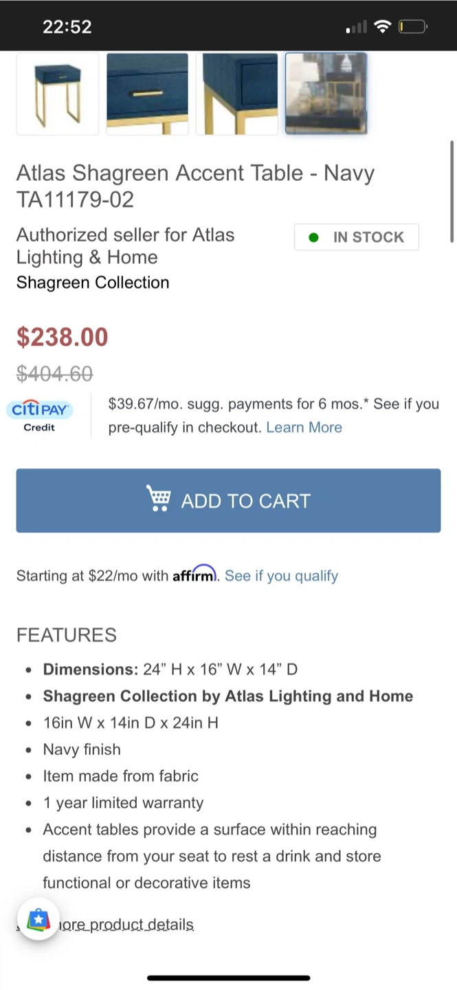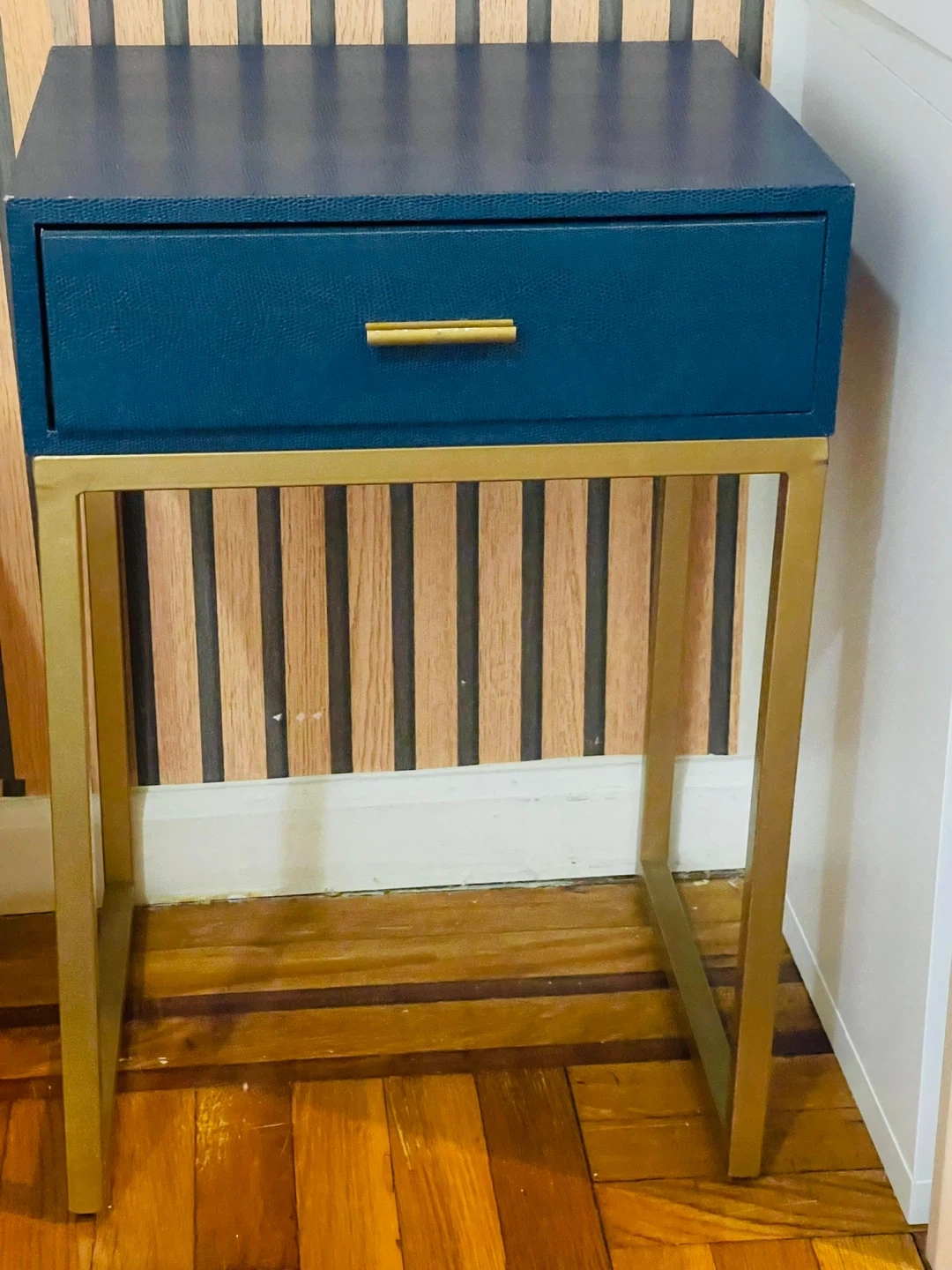 Selling a navy blue Emma Mason Atlas Shagreen Accent Table. It has a gold frame and a drawer for storage. Originally bought for $238!
