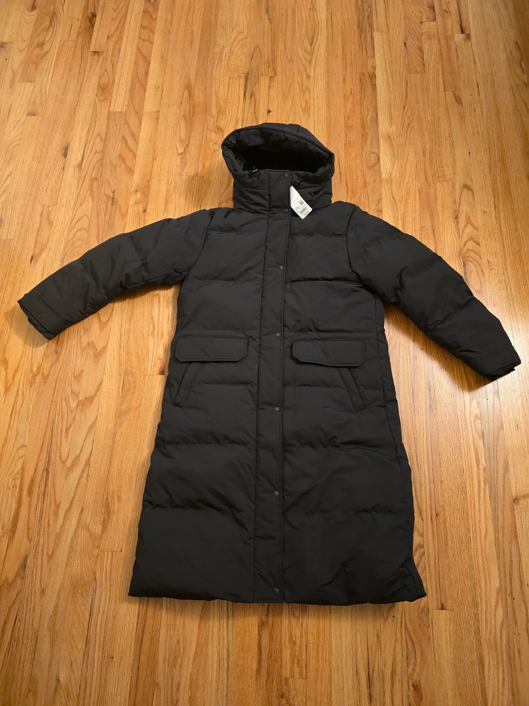 Selling a Uniqlo Ultra Warm Down Long Coat in black, size L for women. It's in great condition and ready to keep you cozy this winter! Originally bought for $229.90