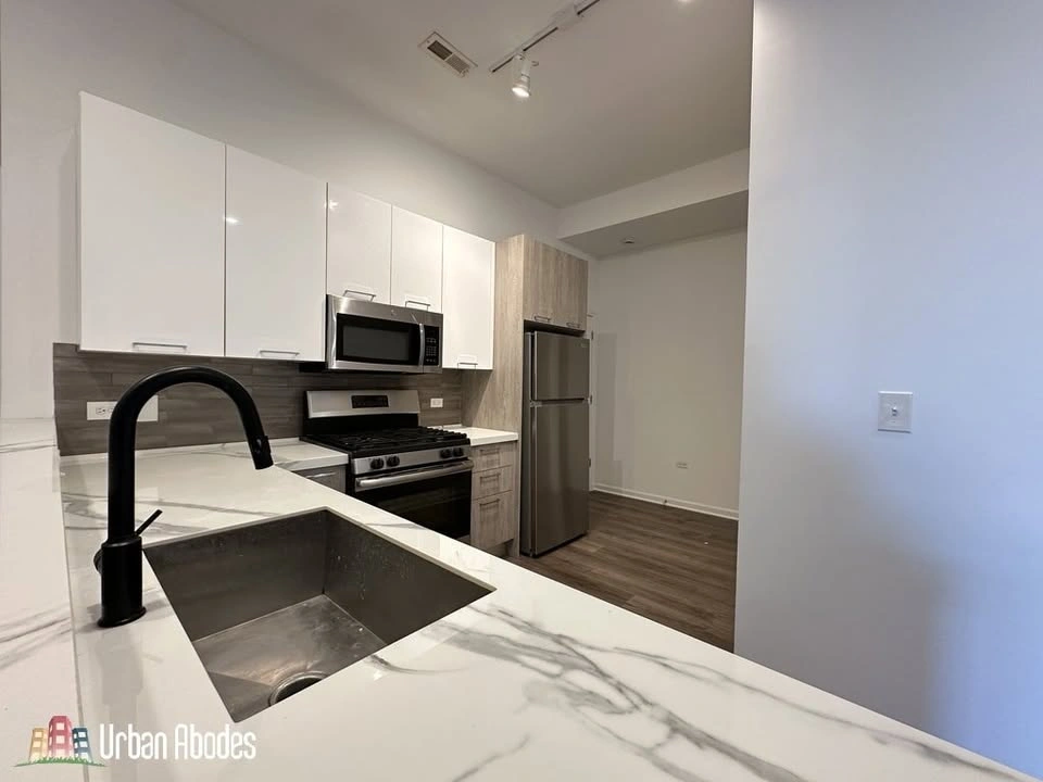 Gorgeous three bedroom, two bathroom in the South Loop features modern eat in kitchen with Italian cabinetry, stainless steel appliances, dishwasher, microwave, large living room, balcony, tall ceilings, track lighting, hardwood floors, large master suite with great walk in closet space, marble master bathroom with double vanity, central heat and air, in unit laundry, pets welcome, and heated garage parking is available. Building features 2000 square foot rooftop deck, elevator, bike room, pet wash station, and fitness room!