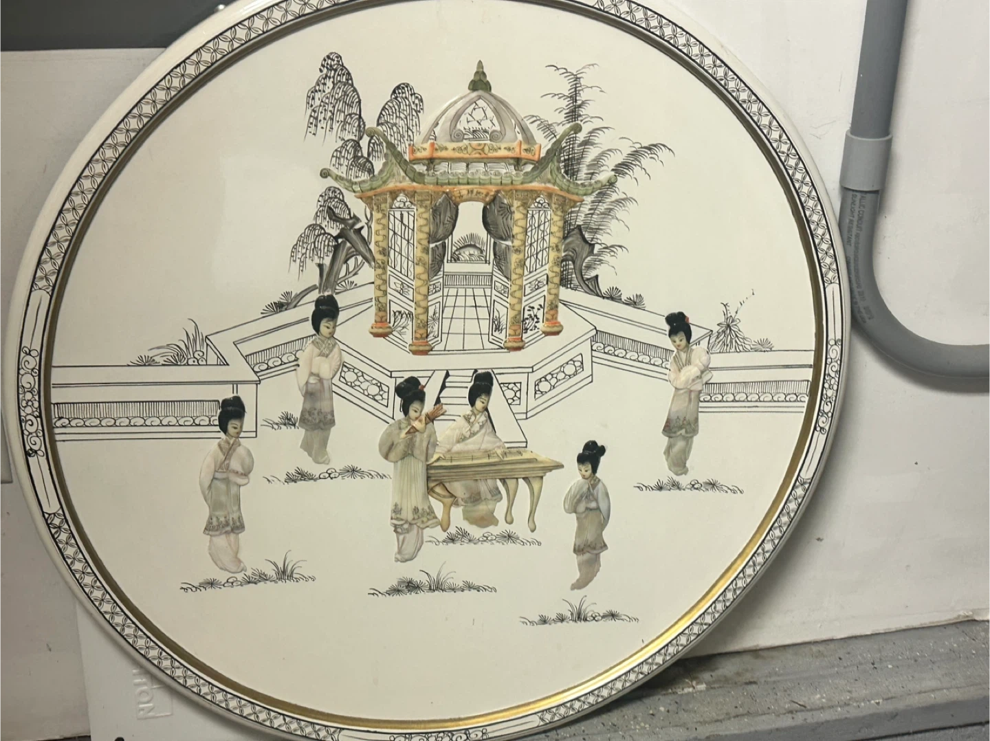This is a beautiful vintage Chinoiserie decorative wall plate. It features a detailed scene with figures and a pagoda-style structure. The plate has a white background with black and gold accents around the rim, adding a touch of elegance to any room!