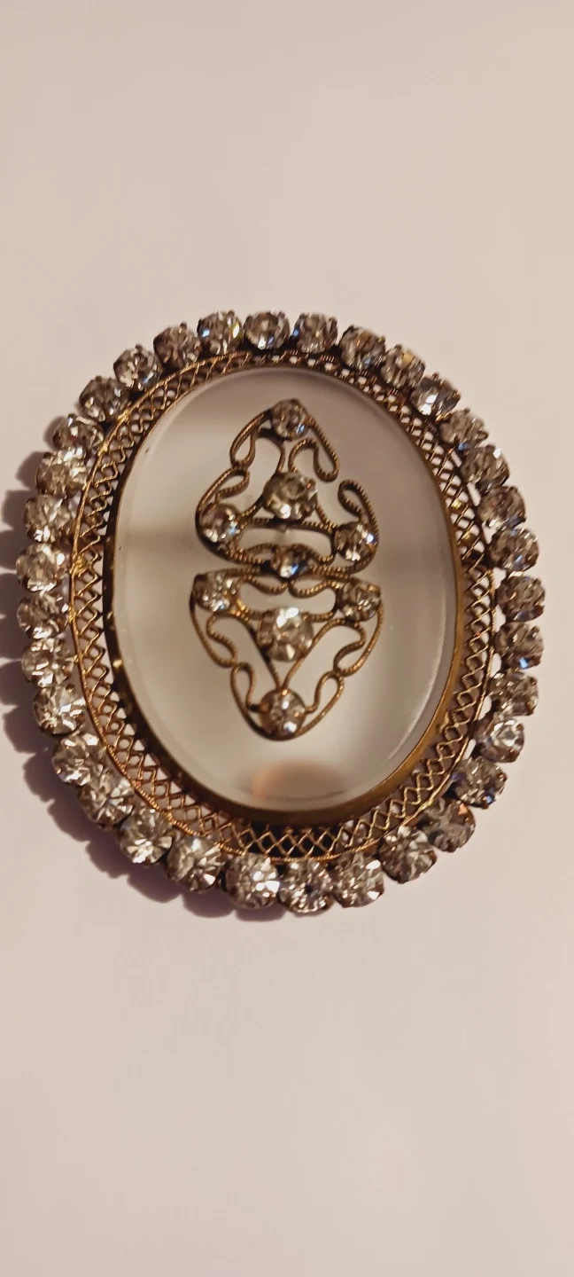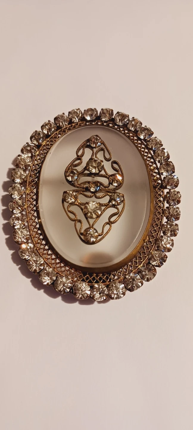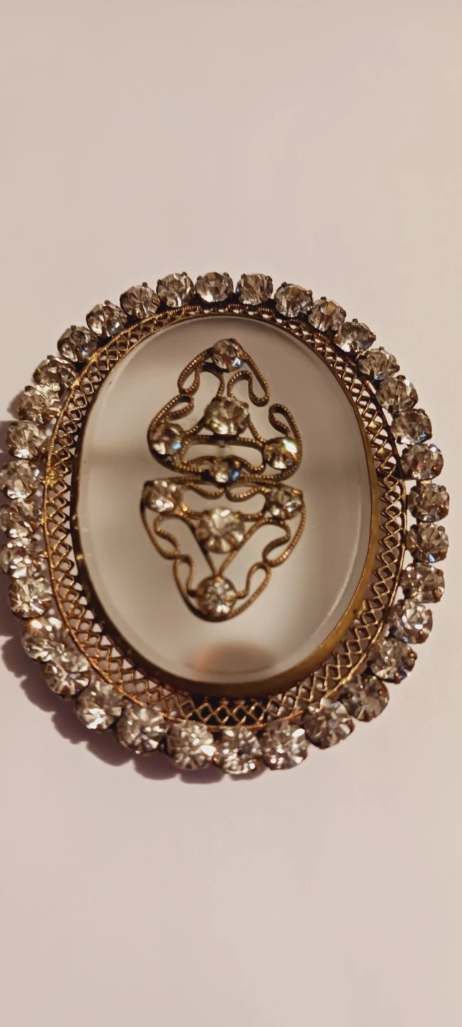 1000+Rare Antique 1920s Art Deco Rock Crystal Openwork Filigree Oval Cameo Brooch. This is a lovely vintage brooch featuring a rounddesign with clear rhinestones. It has an intricate gold tone filigree surrounding a central Rock Crystal Cameo with a unique design. A beautiful accessory to add a touch of vintage charm to any outfit!! 2.5"×2". Excellent condition. ALL MY PRICES ARE NEGOTIABLE !!