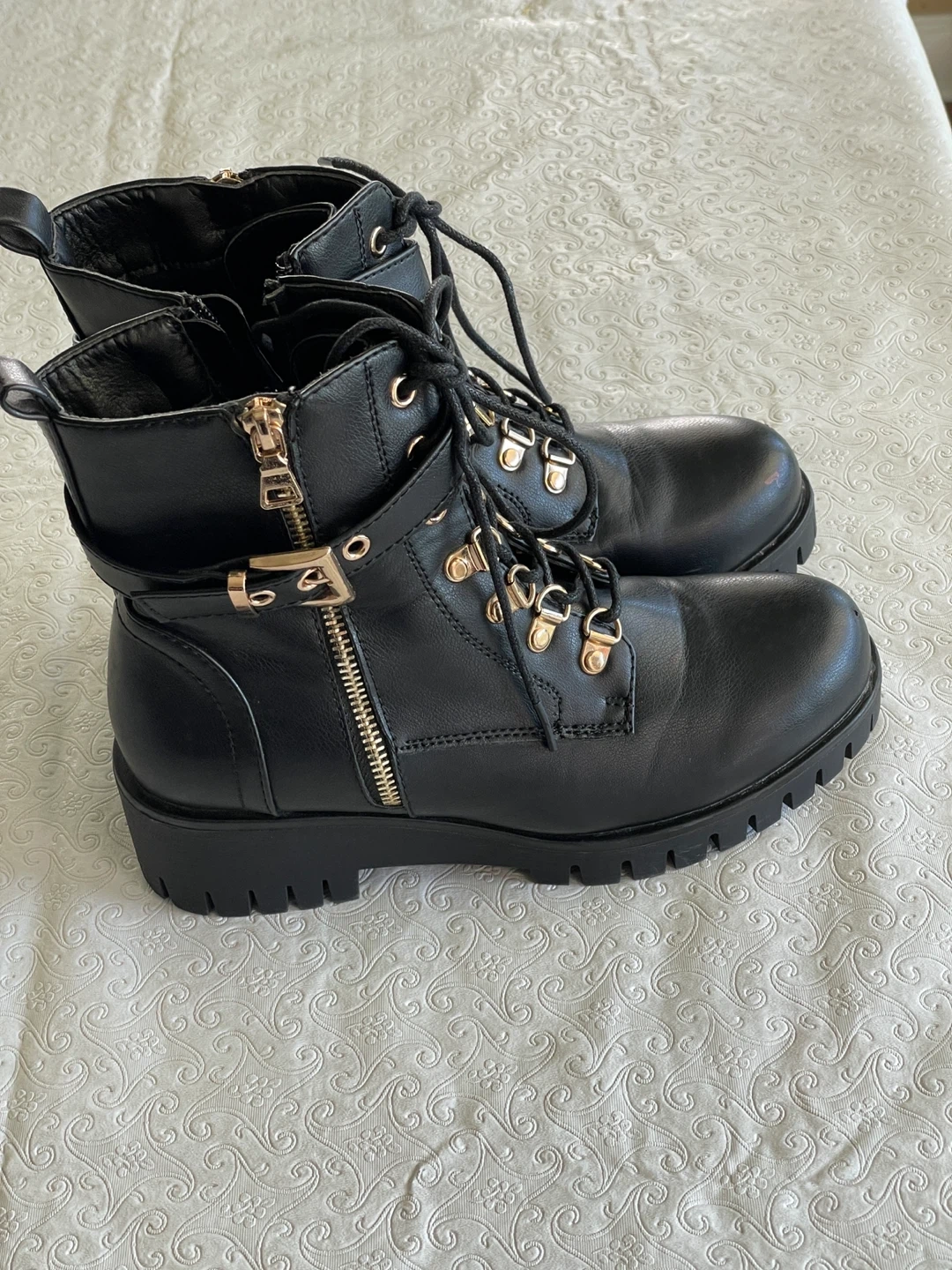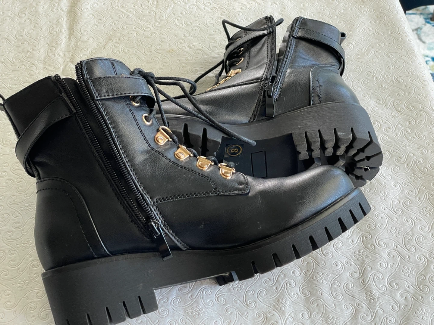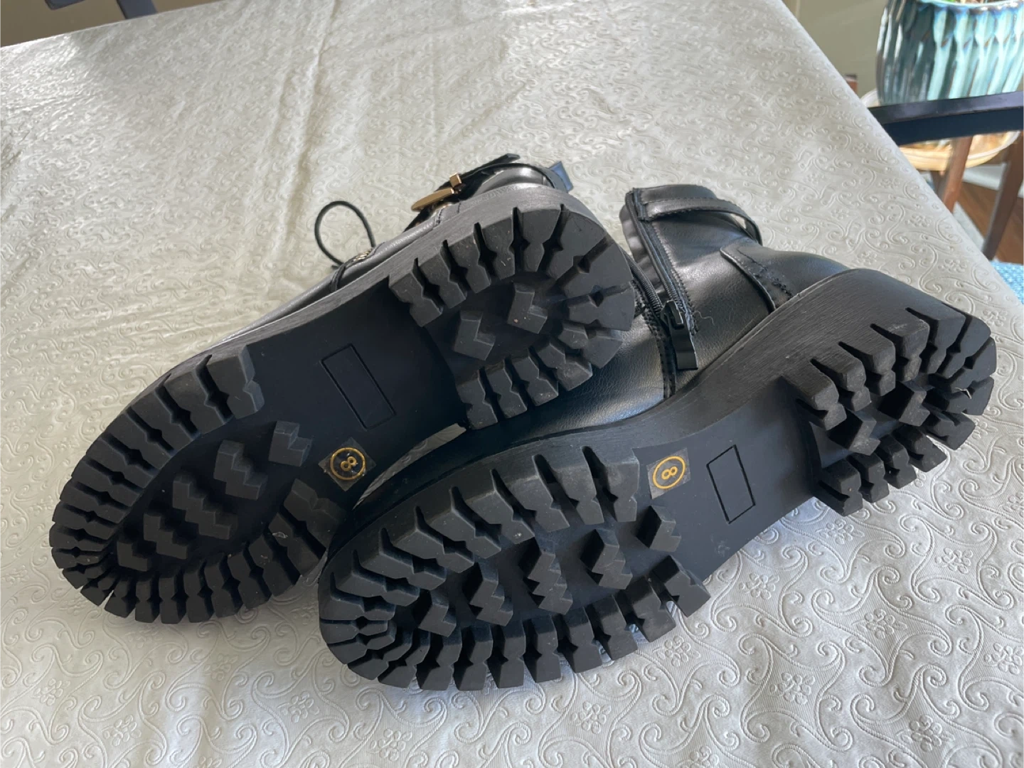 Selling a pair of black ankle boots in size 8. They feature a lace-up design with gold-colored accents and a side zipper. There is a small scratch on the front of one boot, but otherwise these are in new and unworn condition. The soles have a good grip, perfect for everyday wear.