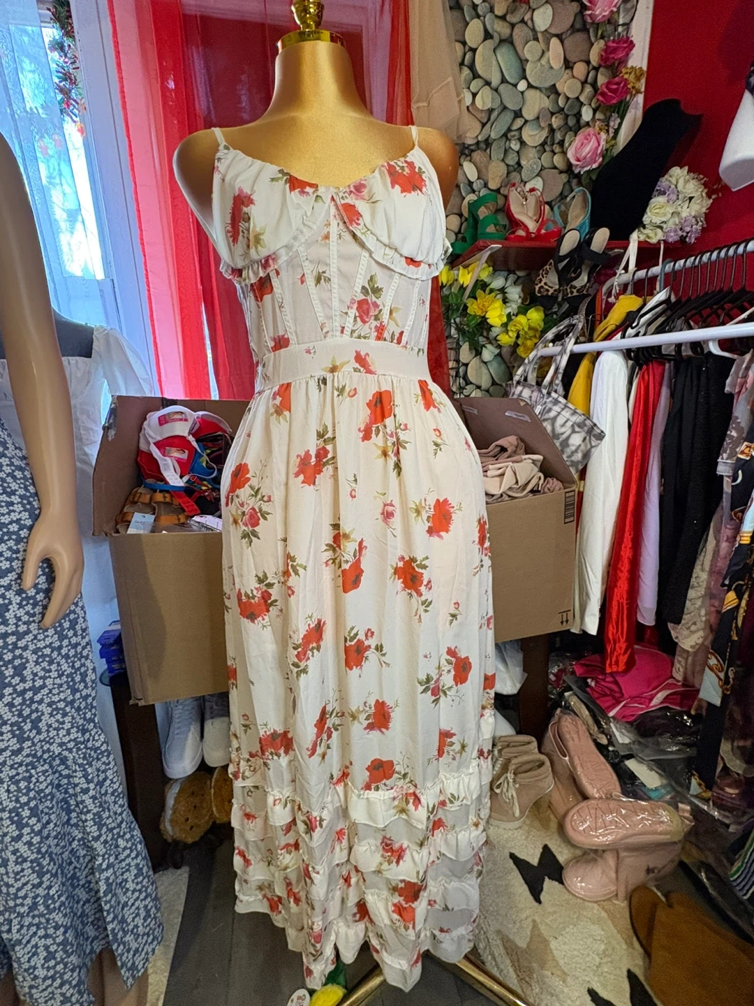 153Selling a beautiful floral print maxi dress! It features a delicate floral pattern in red on a white background. Perfect for a summer day out or a special occasion