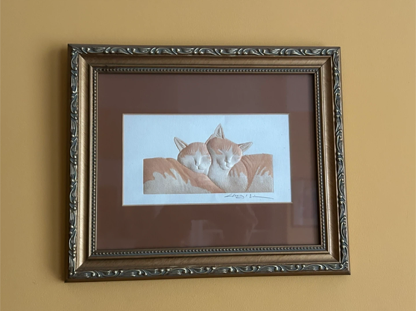 A framed piece of art featuring two sleeping cats. The frame is a decorative gold color, and the artwork itself appears to be a textured print or carving. It would be a cute addition to any cat lover's home! About 12”x14”