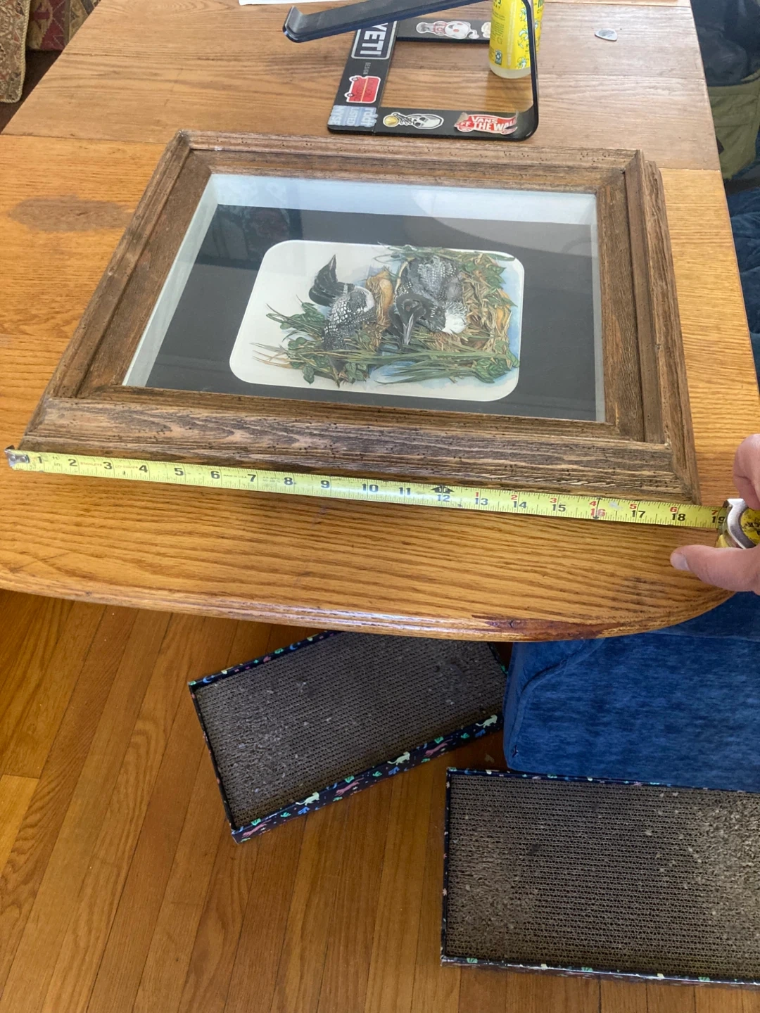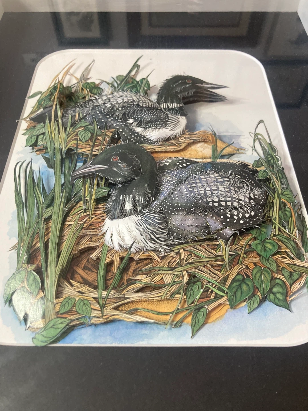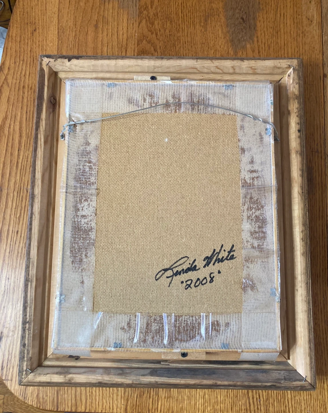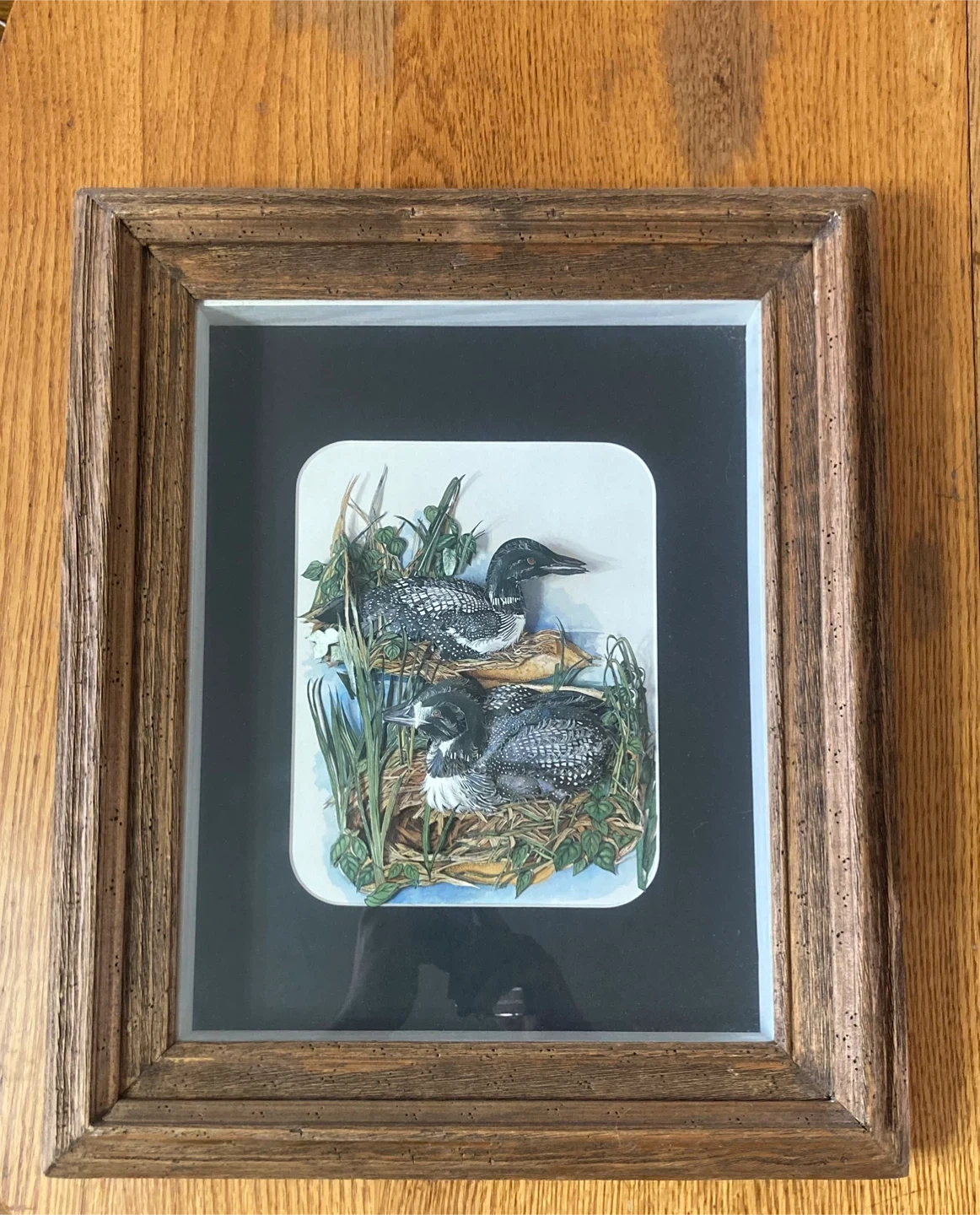 This framed print features a lovely loon design by Linda White. It measures approximately 18 inches in width and 15 inches in height. The print is signed and dated 2008 on the back. It's a charming piece for any nature lover's home