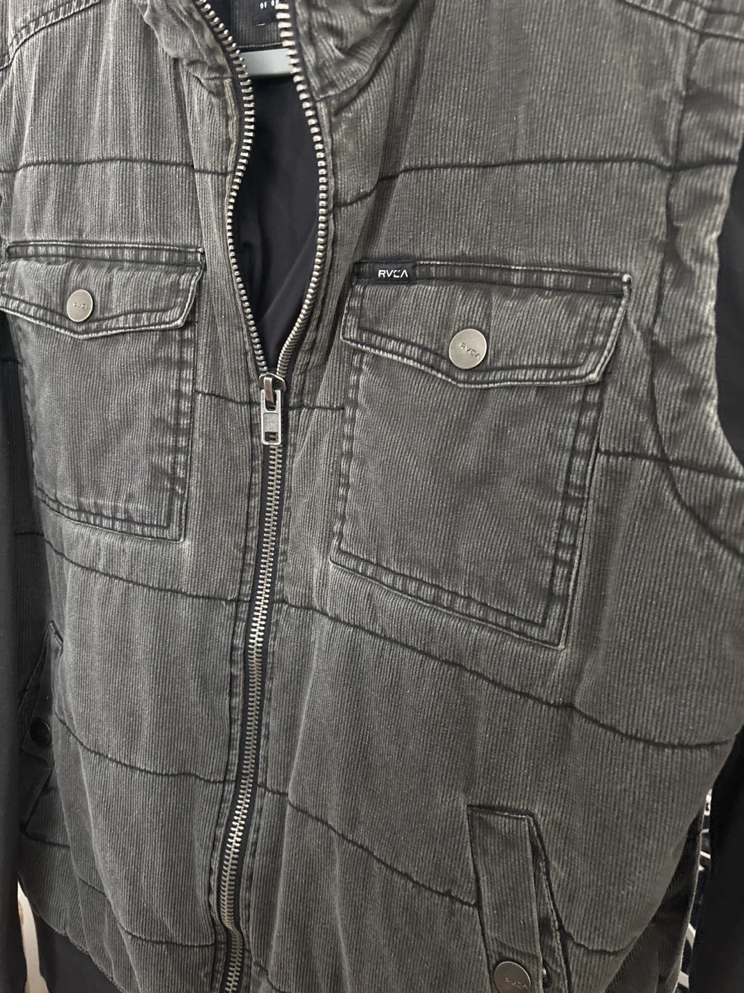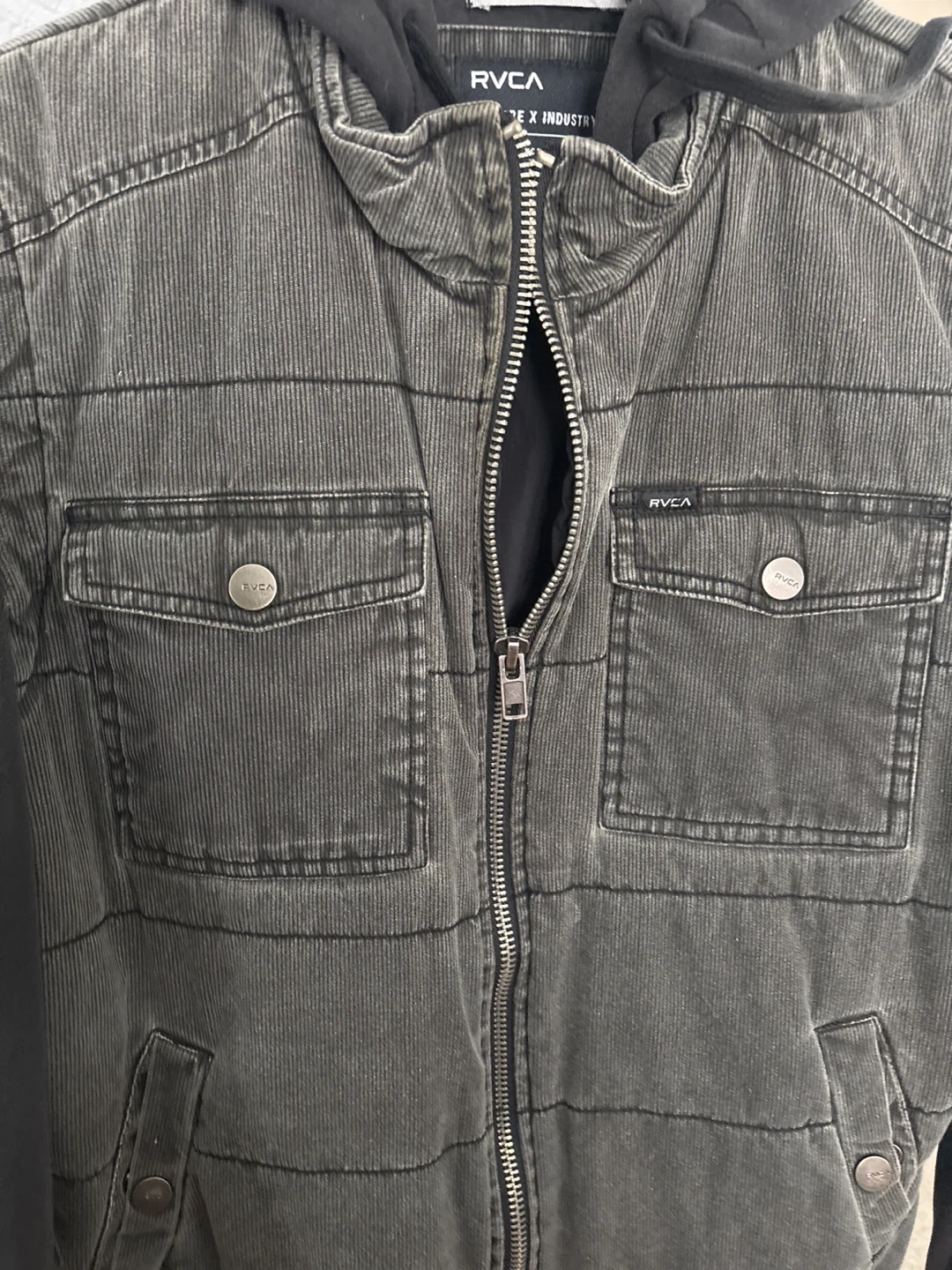 65Selling a RVCA Nature X Industry jacket in size M! It features a corduroy-like texture on the body and a soft, comfortable hood. The jacket has a full zipper and multiple pockets for your convenience. It's in great condition and ready for a new home!