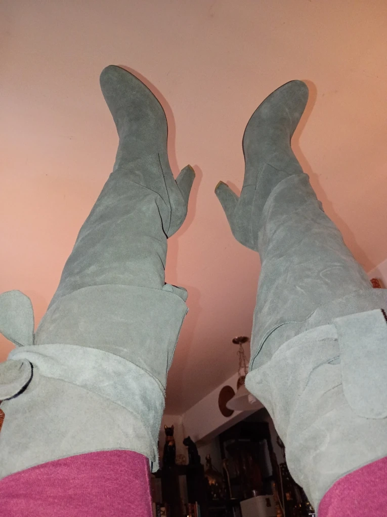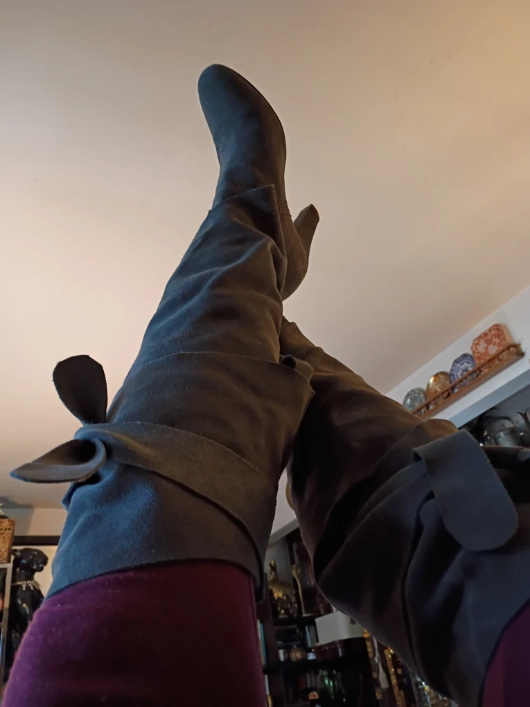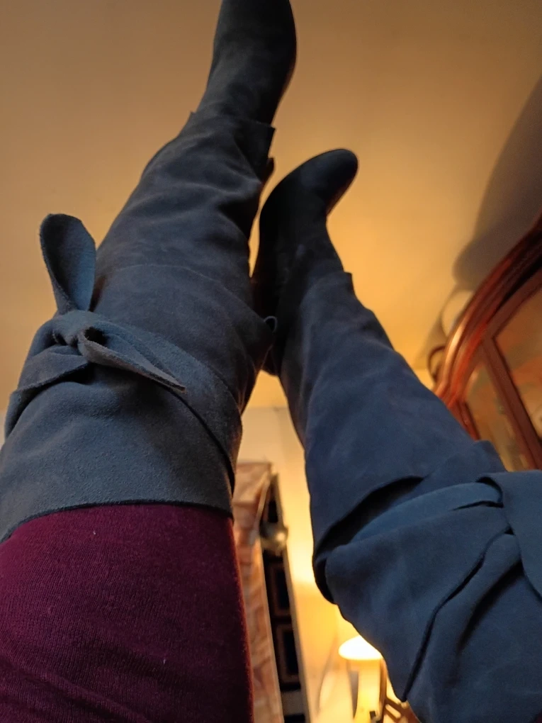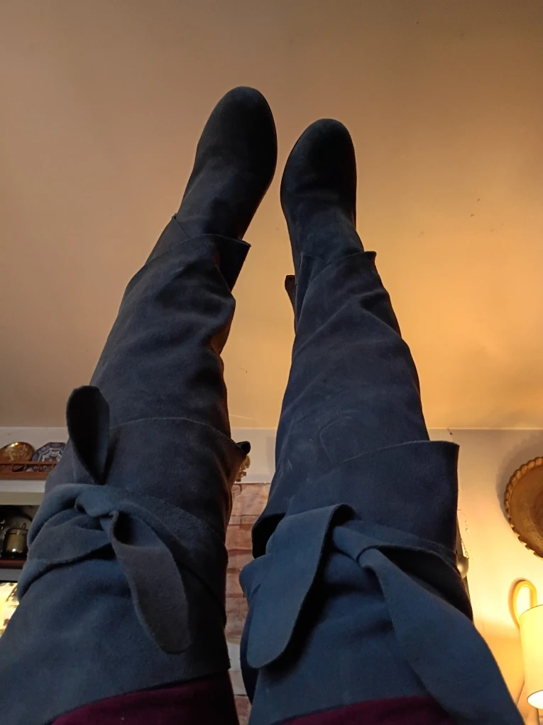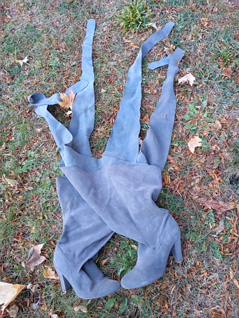 Selling a pair of gray suede over-the-knee boots! They have a stylish design that wraps & ties at the top. Perfect for adding a Boho punch to your outfit. They in great condition.