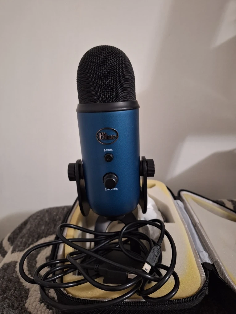 Selling a Blue Yeti USB microphone in blue! It comes with its original case and cable. It's in great condition and ready to use for your recording needs