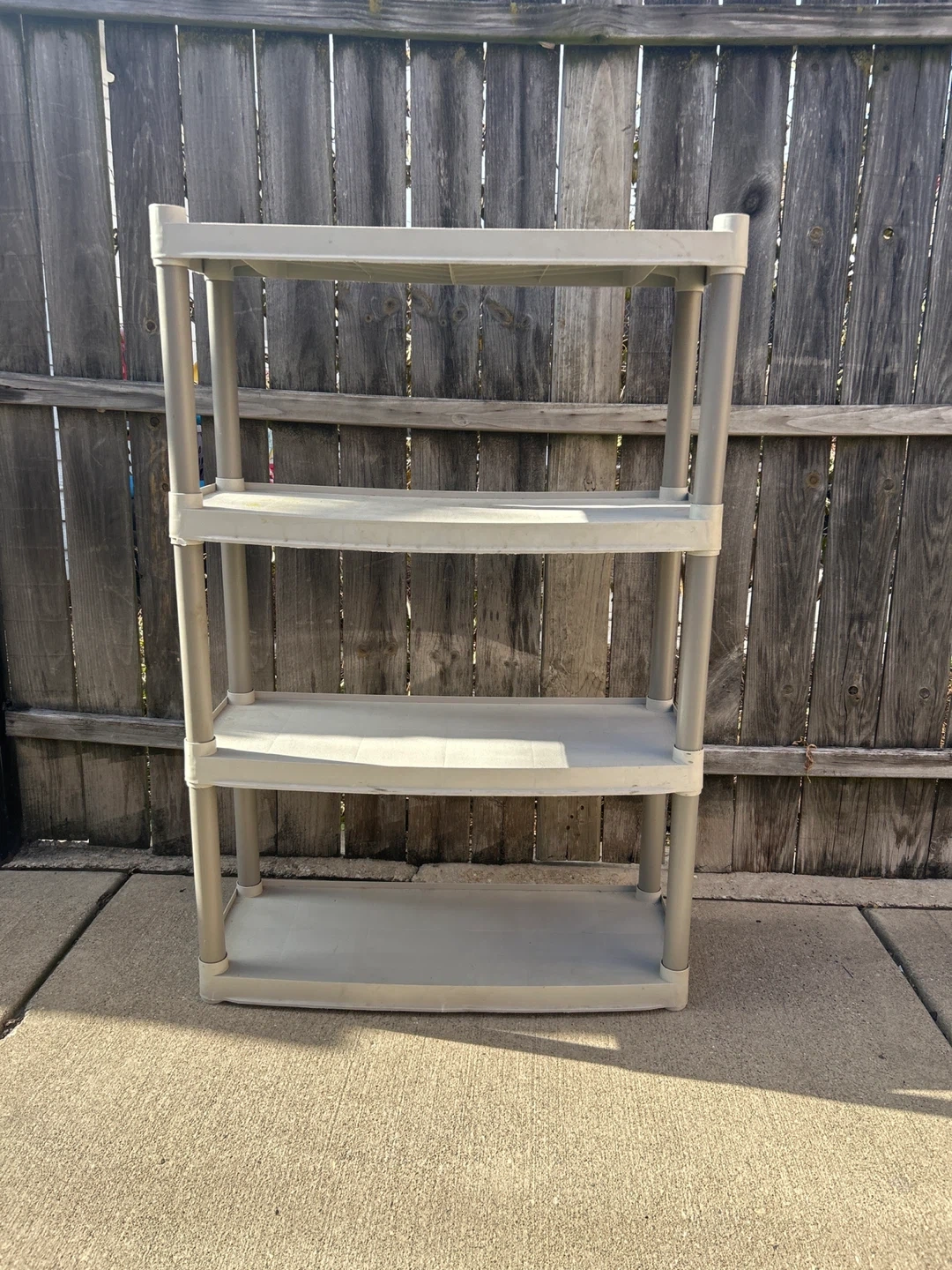 Selling a handy 4-tier plastic shelf! It's in good condition and perfect for organizing items in your garage, basement, or even indoors. It's lightweight and easy to move around, making it a versatile storage solution for any space