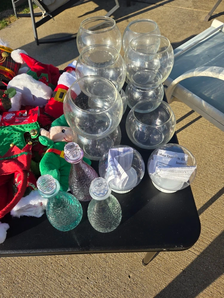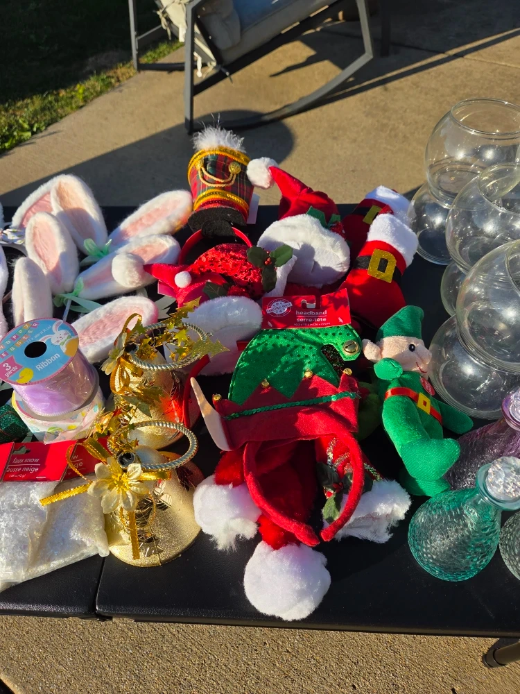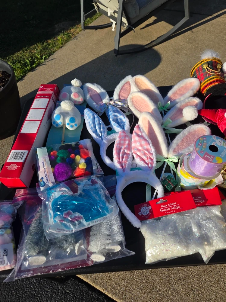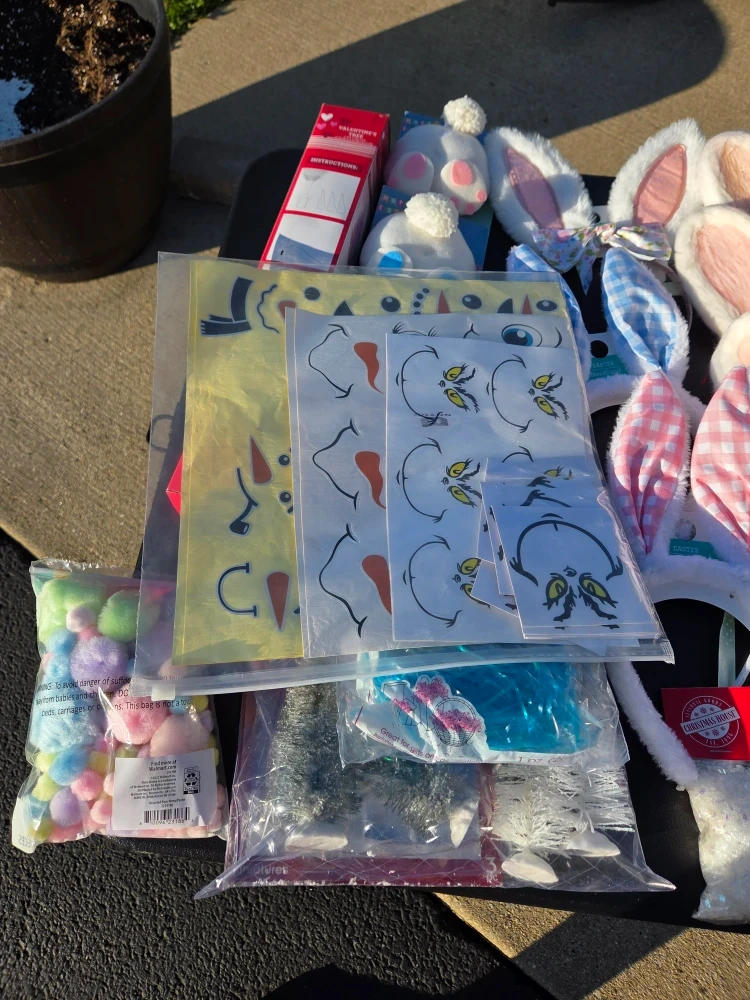 Selling a collection of DIY craft supplies perfect for holiday and seasonal projects! Includes glass bowls, decorative bottles, holiday-themed headbands, Easter bunny ears, pom poms, faux snow, and other embellishments to get your creative juices flowing. Cash Only, pick up only.