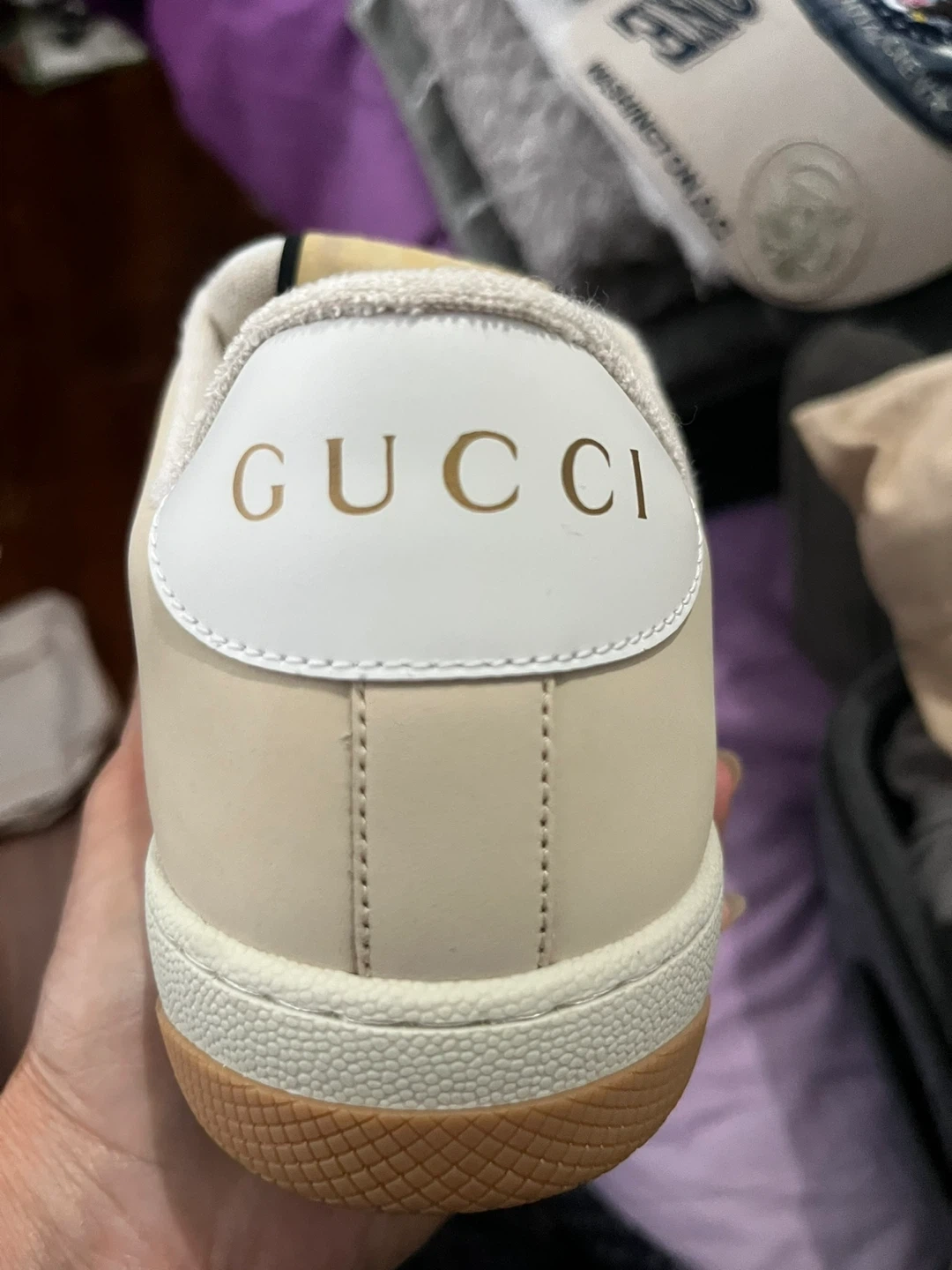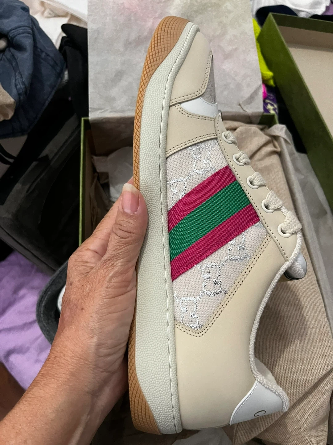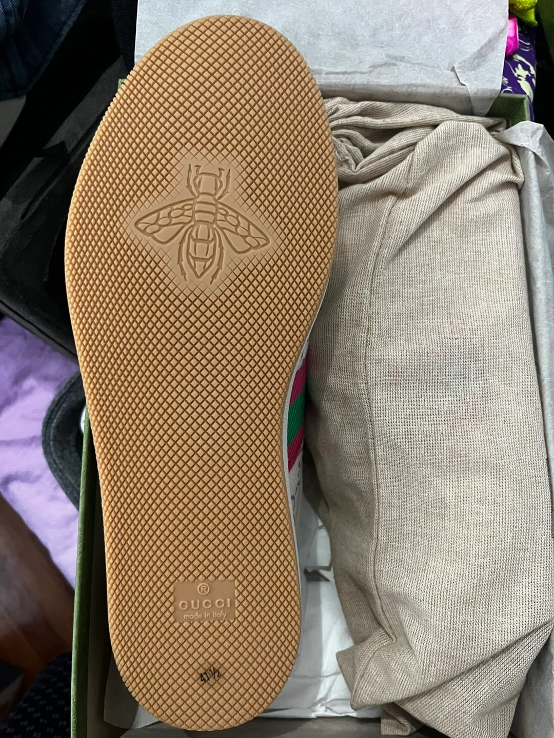Selling a pair of Gucci Screener sneakers in size 41.5. They come with the original box. These sneakers have a cool, vintage-inspired design with the iconic Gucci stripe. The sole features a bee design. They are in great condition and ready for a new home!