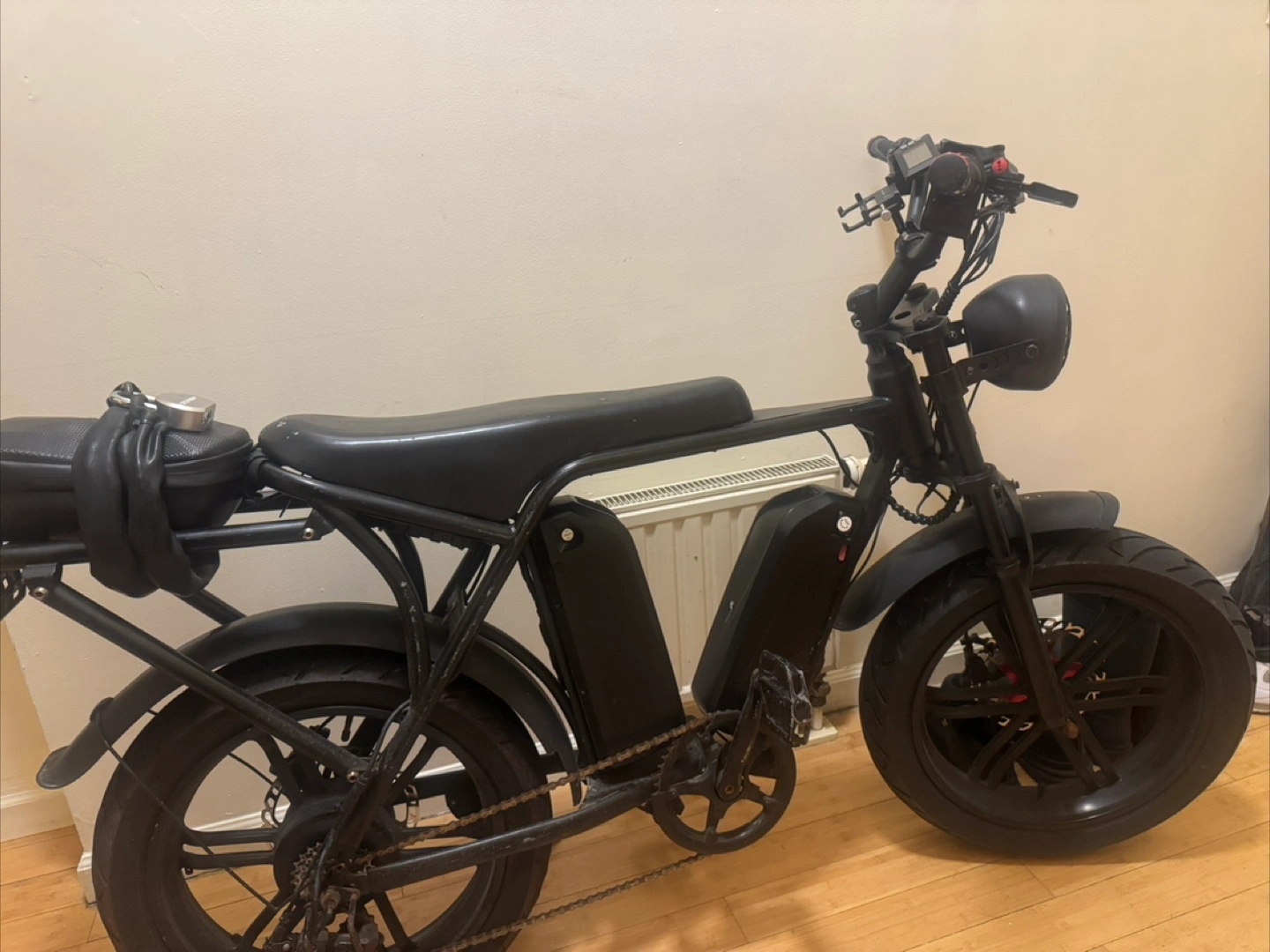 48v 60ah battery! Has 2 of the 48v 30ah batteries which makes 60ah. You can use one battery at a time or both. To be safe only use both batteries when they are fully charged. Great for delivery guys! You can last 12 hours on 15mph around 8-9 doing 20mph. motorcycle tires. Better grips. Half twist throttle. Very thick tires! Rear rack is removable. Tires also have “flatout” in them. You will not catch a flat if you do then you definitely ran over a nail lol. Even then will be hard to get flat because of the “flatout”