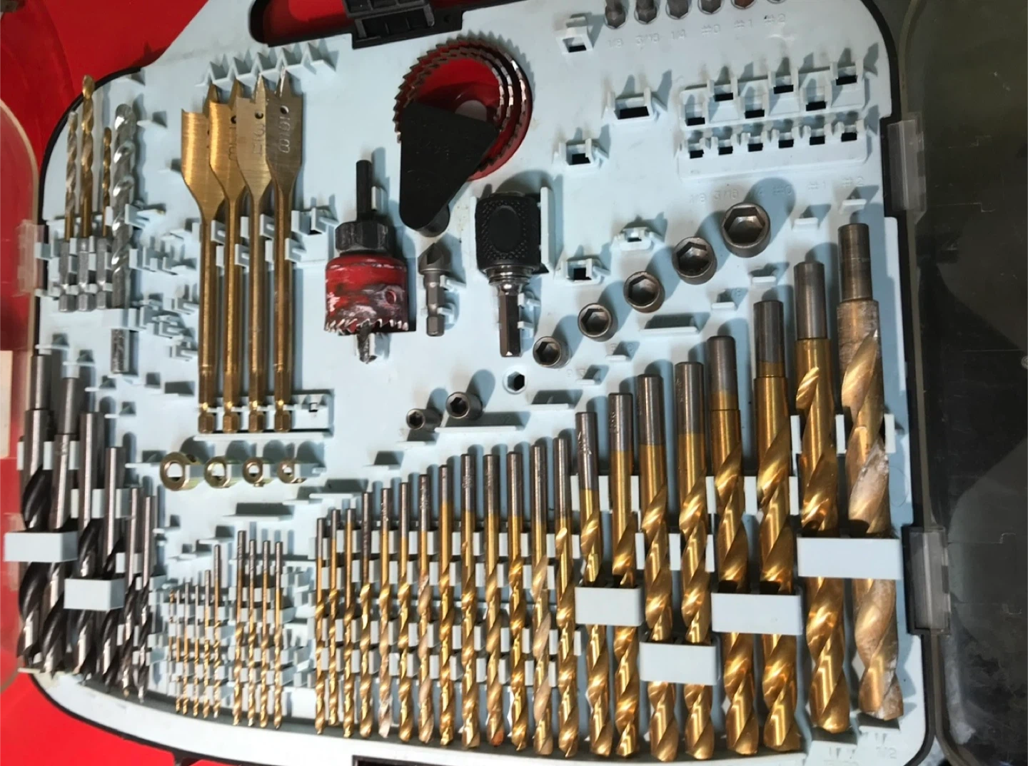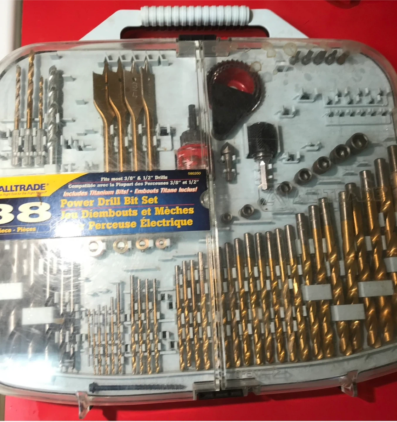 Selling an Alltrade power drill bit set! It's compatible with most 3/8" & 1/2" drills and includes titanium bits. Comes in its original case.Some pieces missing.