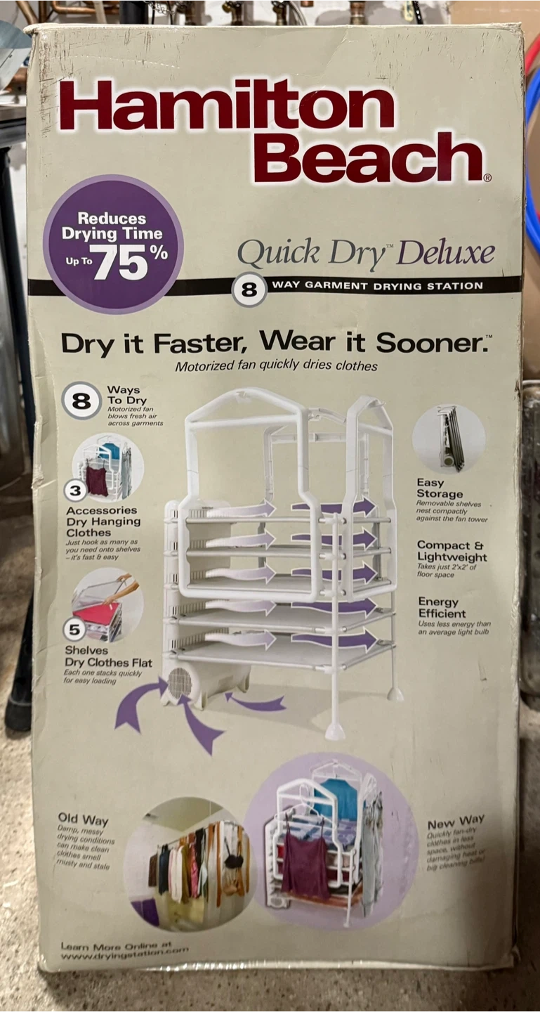 I have a Hamilton Beach Quick Dry Deluxe 8-Way Garment Drying Station for sale! It reduces drying time up to 75%. It dries clothes faster, so you can wear them sooner.
