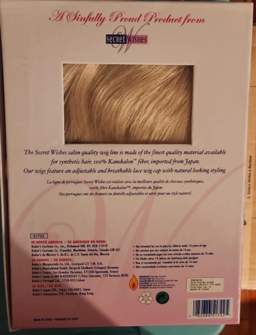 Selling a Secret Wishes Salon Quality Wig, the Elise model. It's adjustable and breathable for a comfortable fit. Made with silky-soft imported fiber, it's also shampoo washable. The wig is made of 100% Kanekalon fiber imported from Japan and has a real hair feel