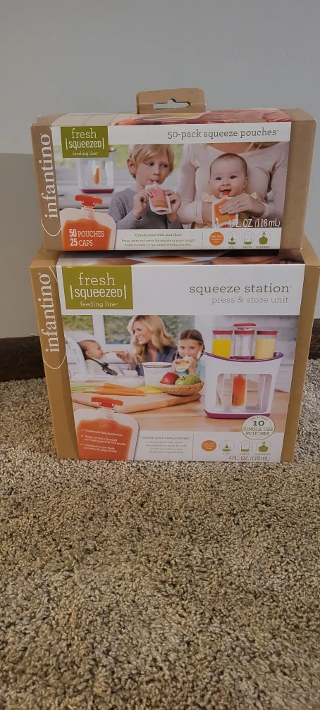 NEVER OPENED. I'm selling an Infantino Fresh Squeezed Squeeze Station press & store unit and 50-pack squeeze pouches! Now you can easily fill your own pouches in 4 easy steps. It's a great way to offer your baby fresh, healthy foods to offer your baby in single serves and save! You can buy in bulk, serve in singles and save!