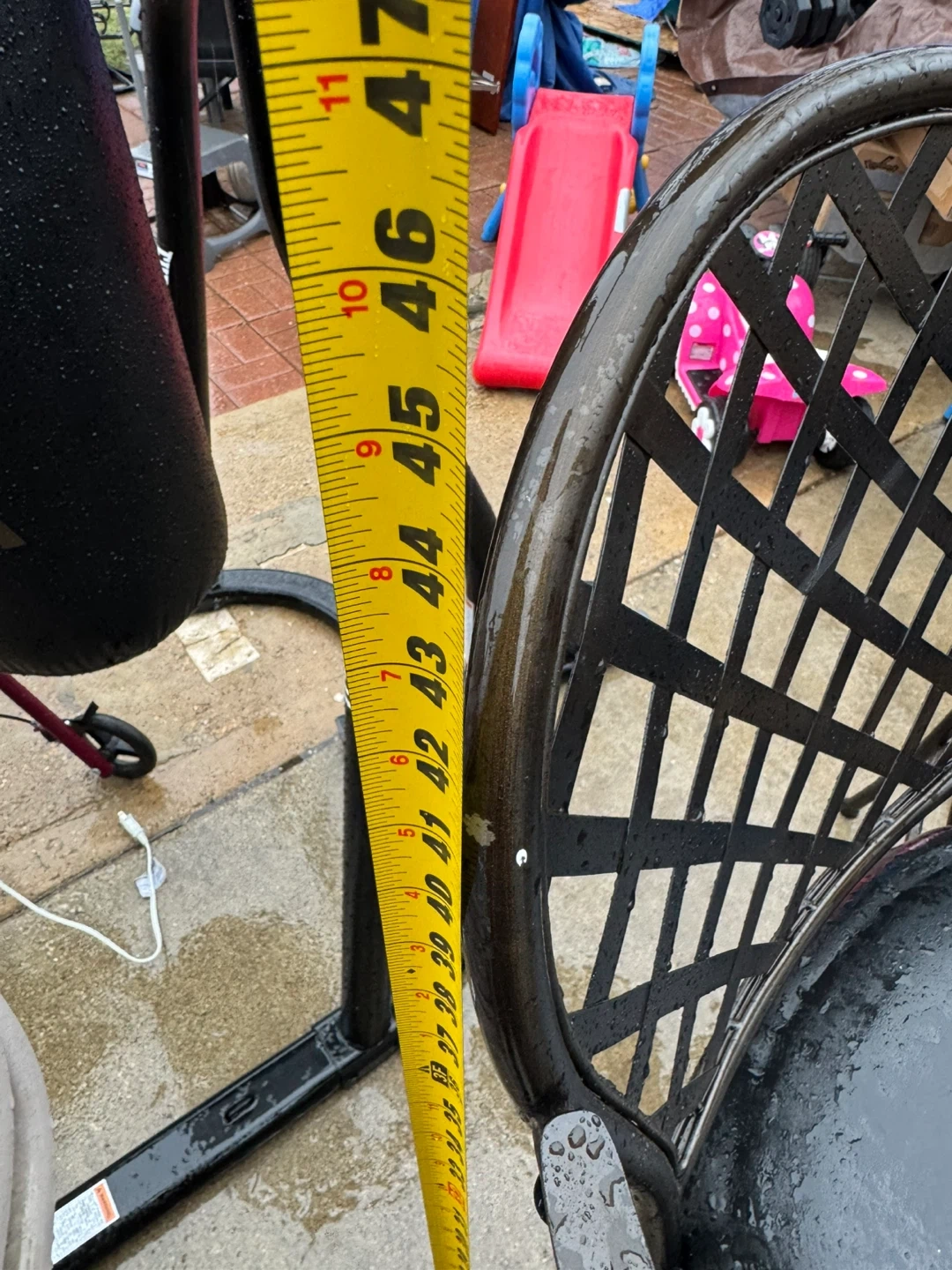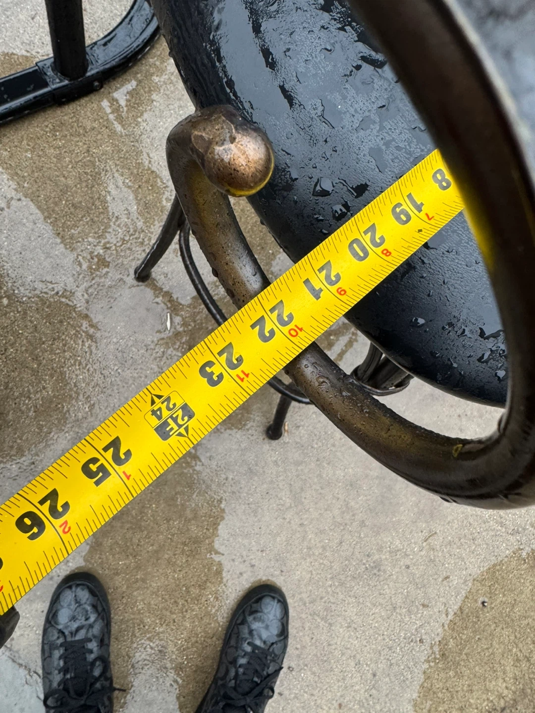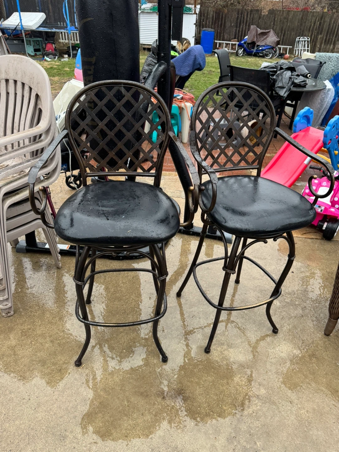 Selling a set of two black swivel bar stools. They feature bronze-colored accents on the scrolled arms and frame. The seats are cushioned and the backrests have a decorative lattice design. Stool height is approximately 46 inches. Great for a kitchen island or home bar!