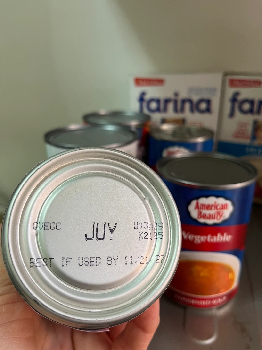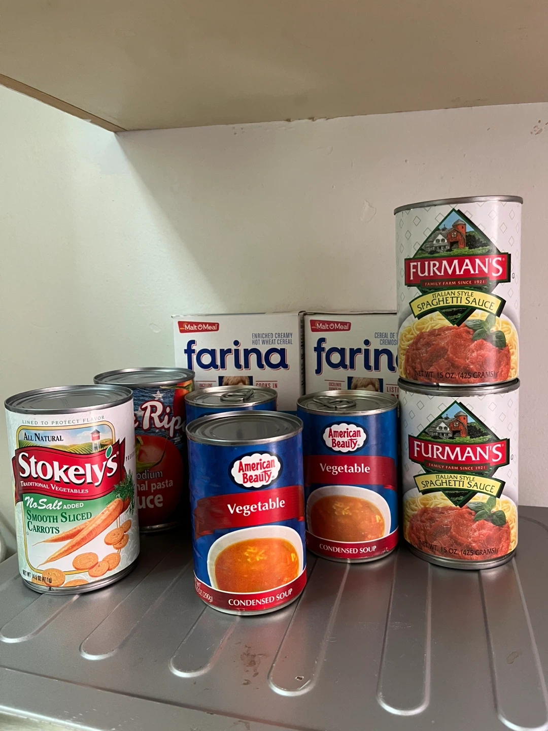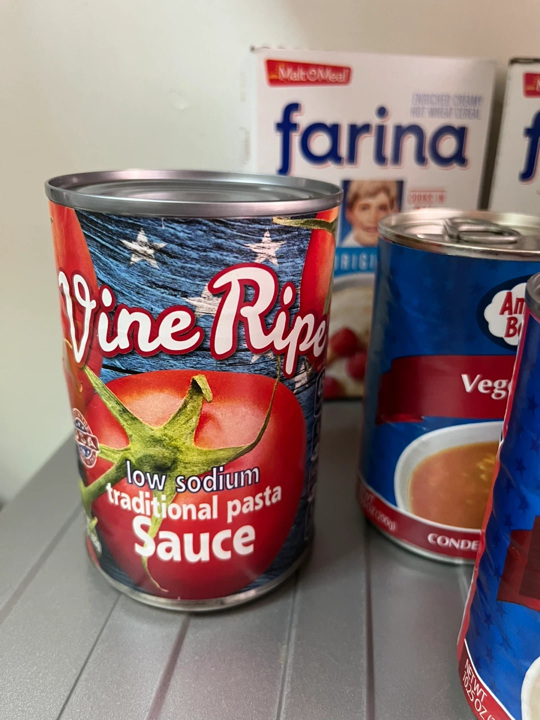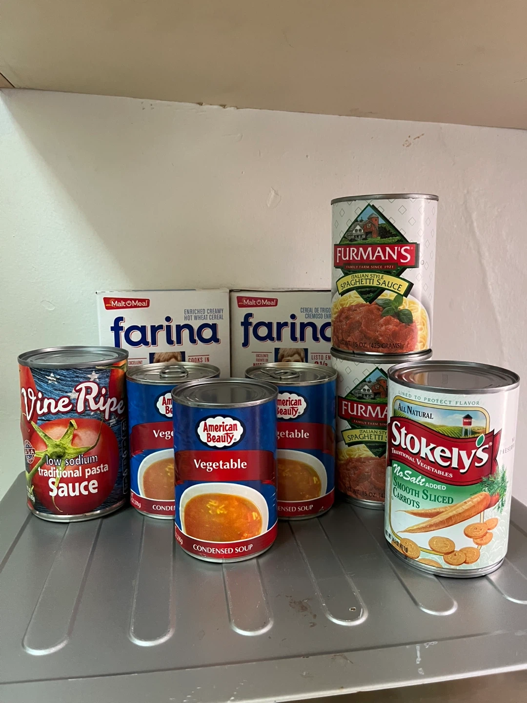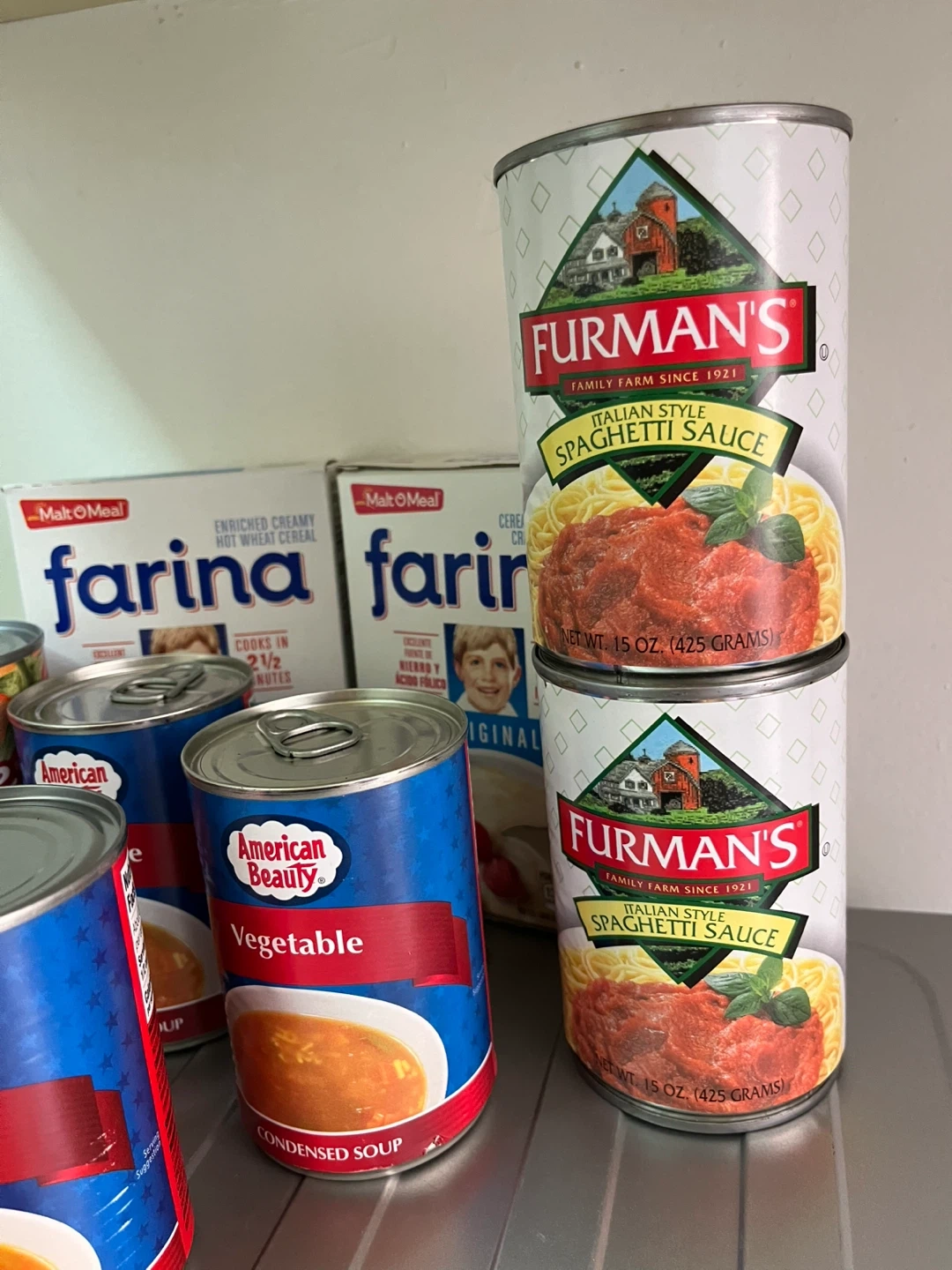 Bundle includes American Beauty Vegetable Condensed Soup and Mak-O-Meal Farina Original Enriched Creamy Hot Wheat Cereal. Cans are 10.5 oz. Farina boxes are standard size.