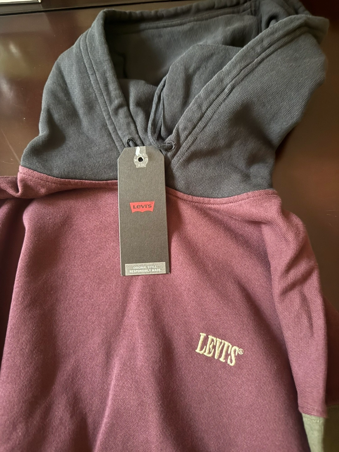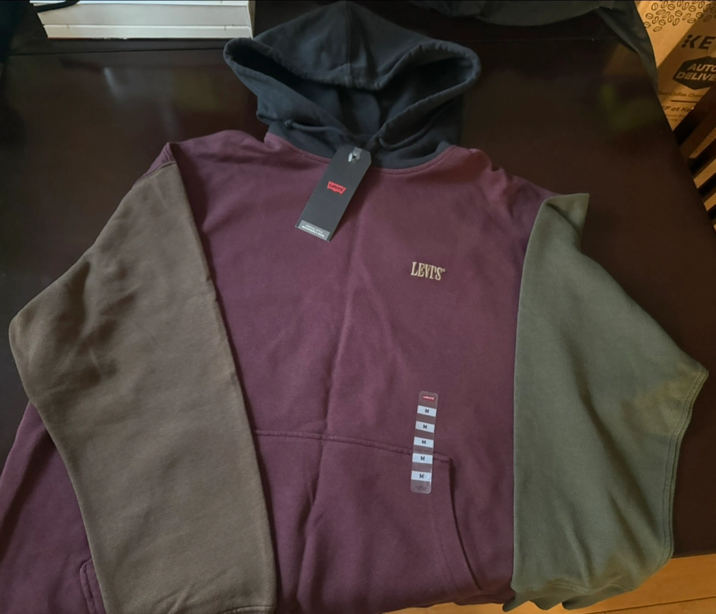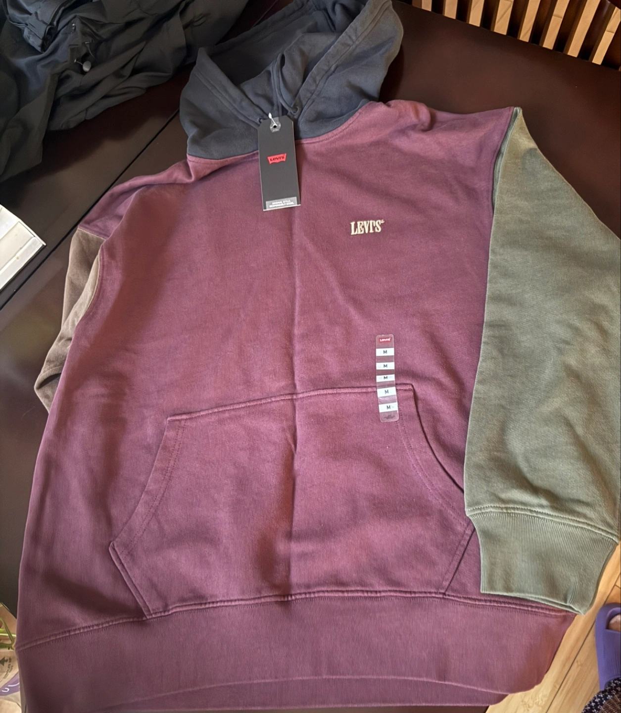 Men's Levi's hoodie. Size Medium. Colorblocked design. Burgundy, olive green, and black. New with tags.