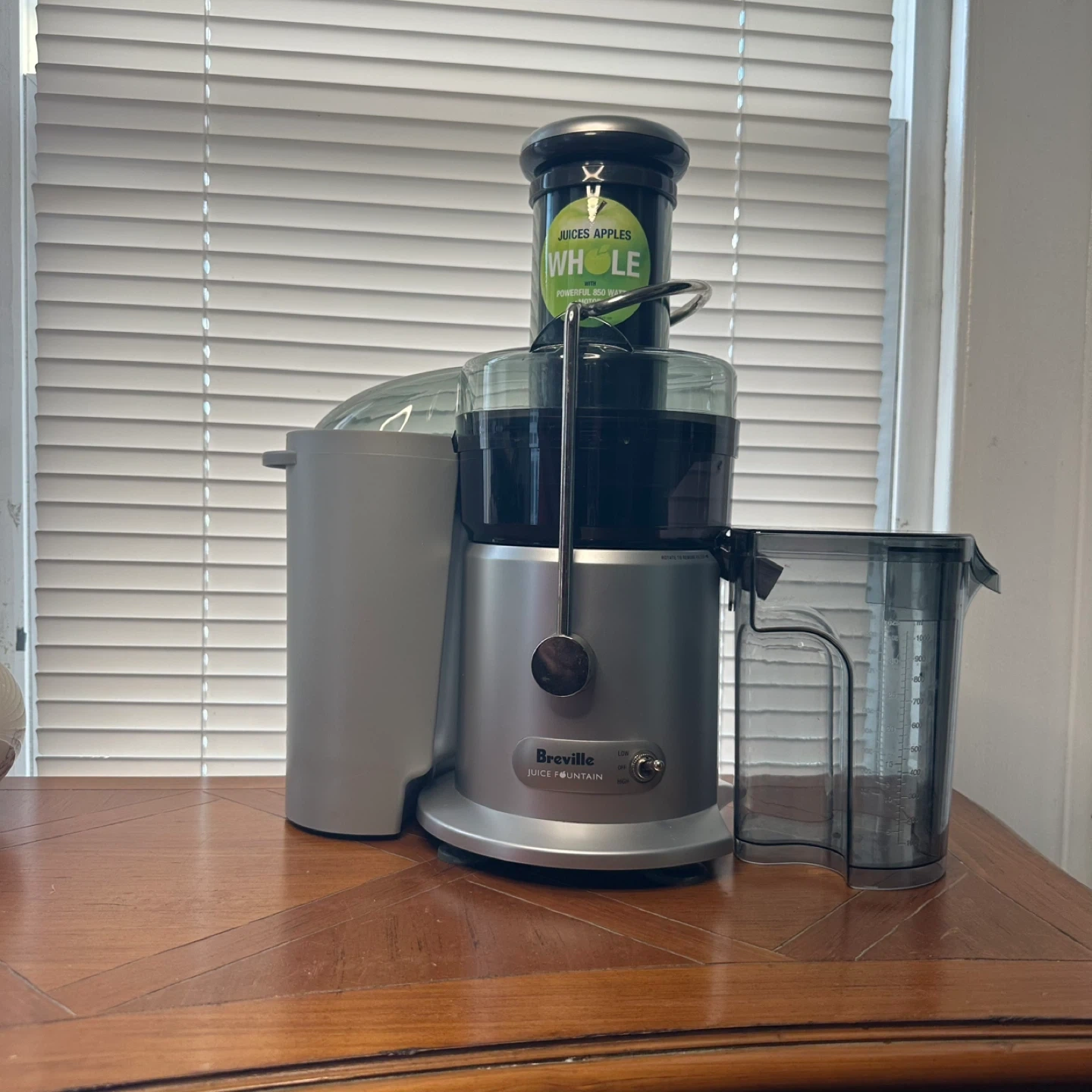 Selling a Breville Juice Fountain. It juices apples whole with a powerful 850 watt motor. It has a low, off, and high switch.