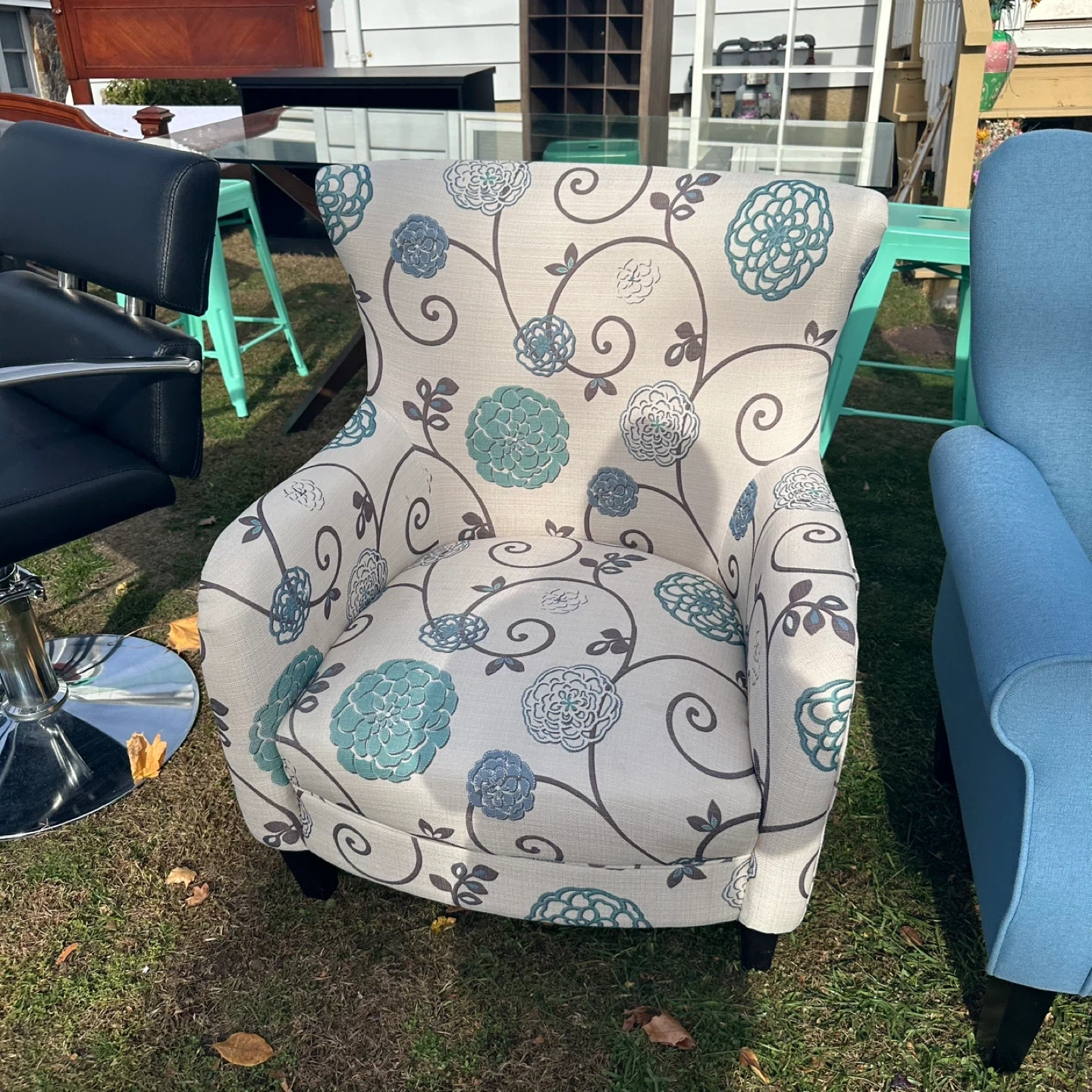 This accent chair features a lovely floral pattern in shades of blue and gray on a light background. It would be a great addition to any living space!