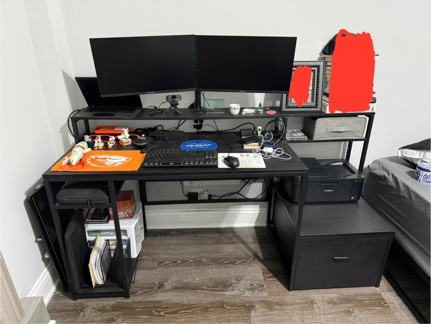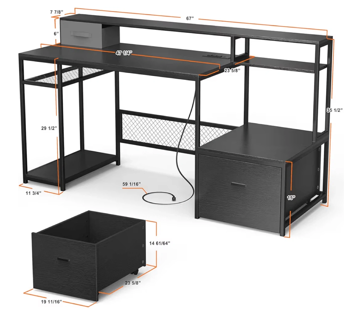 Selling a black computer desk with drawers and plenty of storage! This 66" desk has a monitor stand, outlets, and USB ports. It also comes with a file cabinet, perfect for a home office or gaming setup