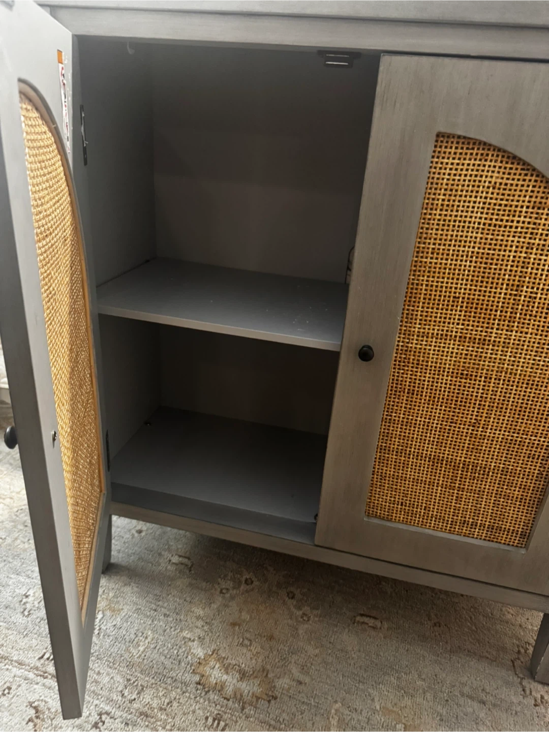 This stylish gray cabinet is a high end floor sample . features unique rattan door panels, adding a touch of natural texture to any room. It offers ample storage space with interior shelves, perfect for organizing your belongings. The neutral gray color ensures it will blend seamlessly with your existing decor. A great piece to add both function and flair to your home! Orig price 450.00