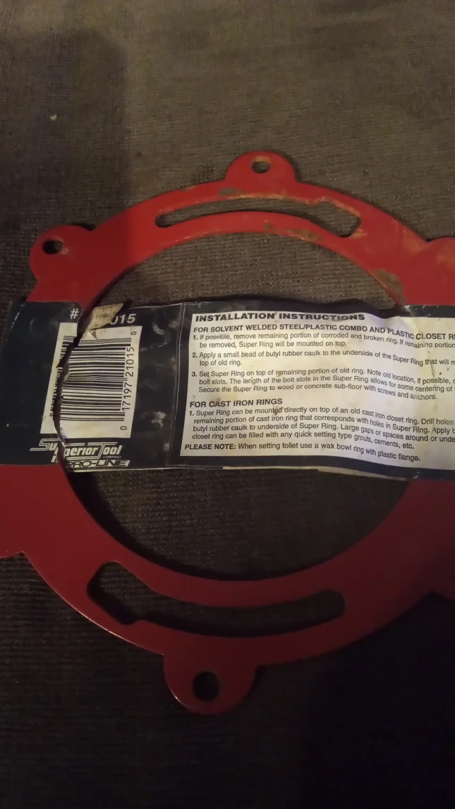 Selling a Superior Tool Company Super Ring closet flange. It replaces any closet ring and has unique scorable tabs to be securely attached to concrete or wooden sub-floors. It has slotted holes for corrosion protection.