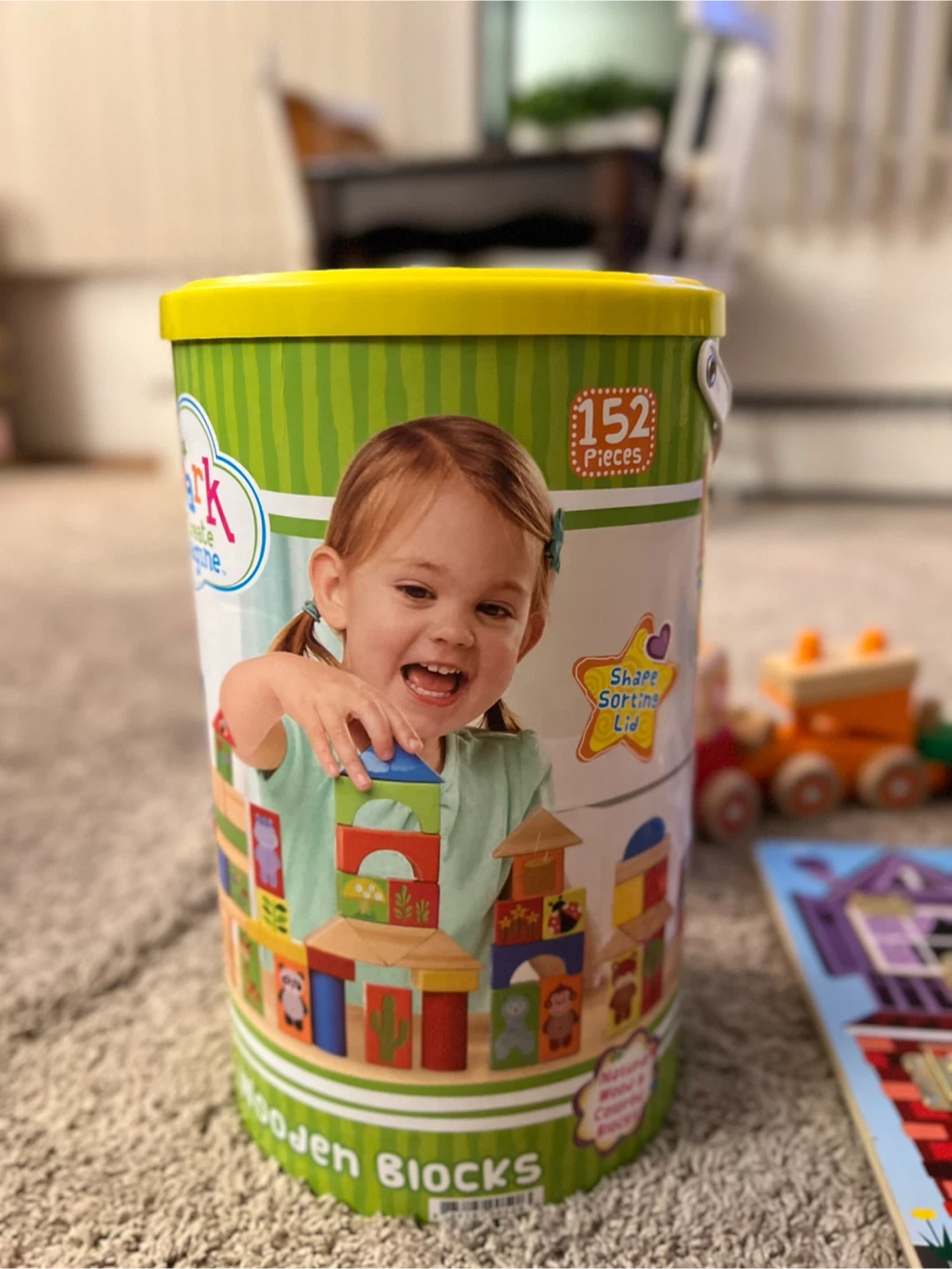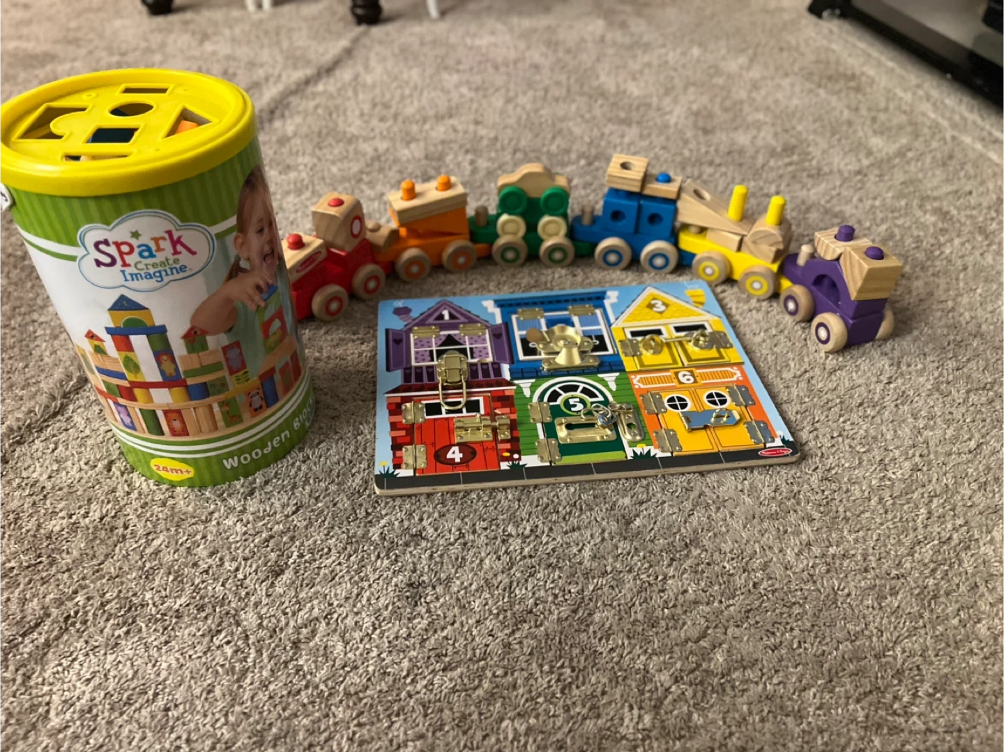 Selling a set of toys perfect for toddlers! Includes a Spark Create Imagine Wooden Blocks set with 152 pieces and a Melissa & Doug Latches Board. Both are in great condition and ready for a new home! And a wooden train.