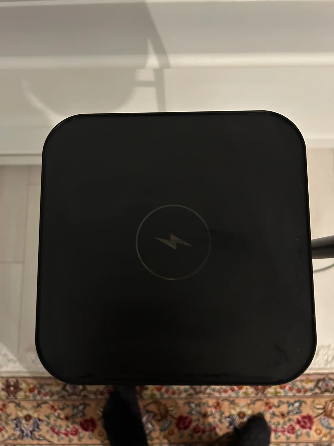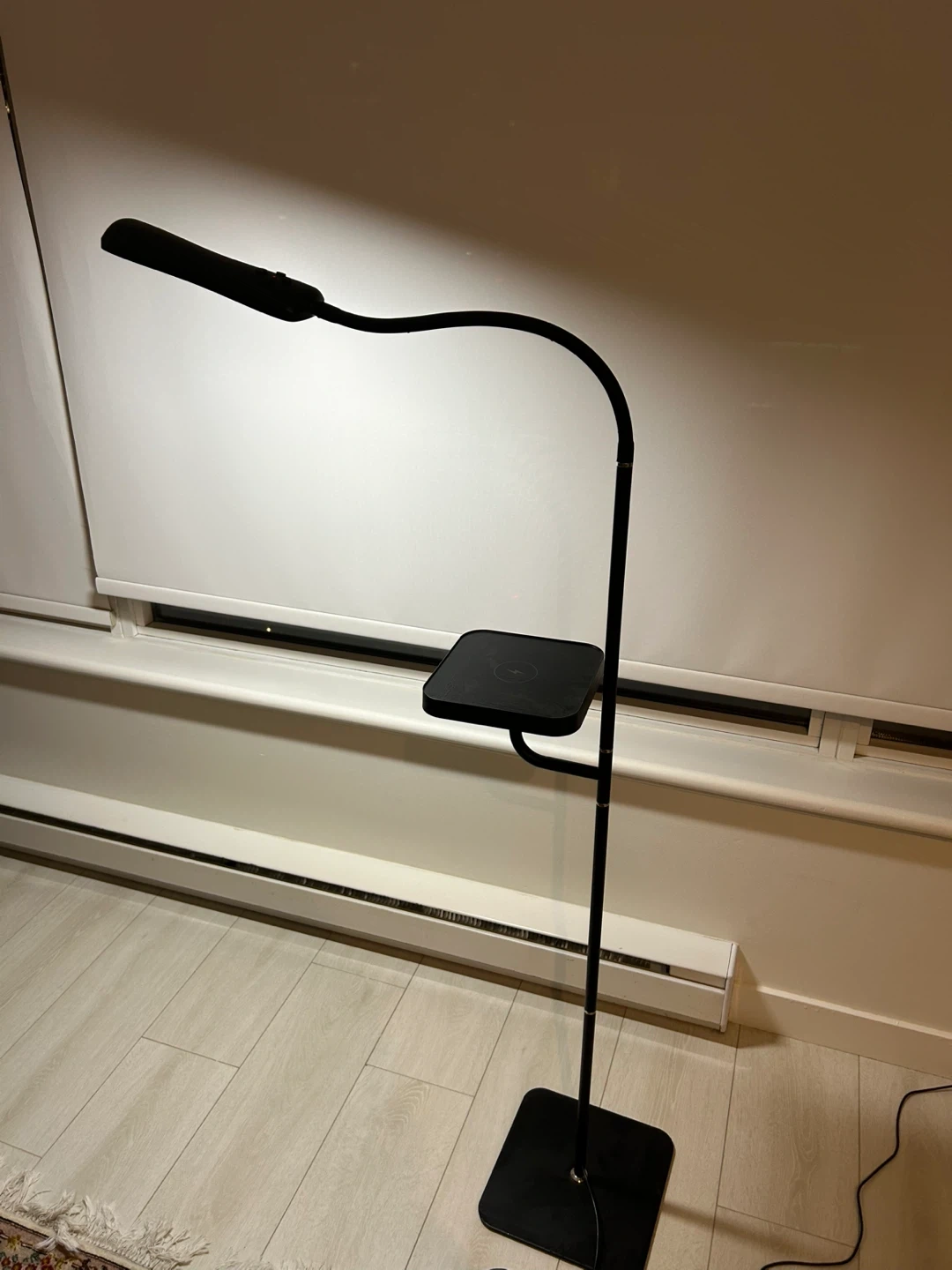 Selling a sleek black LED floor lamp. It features a built-in wireless charging pad, perfect for keeping your devices powered up. The lamp has adjustable settings for brightness and is in great condition!3 type of light and adjustable brightness on each light setting