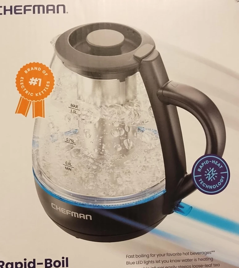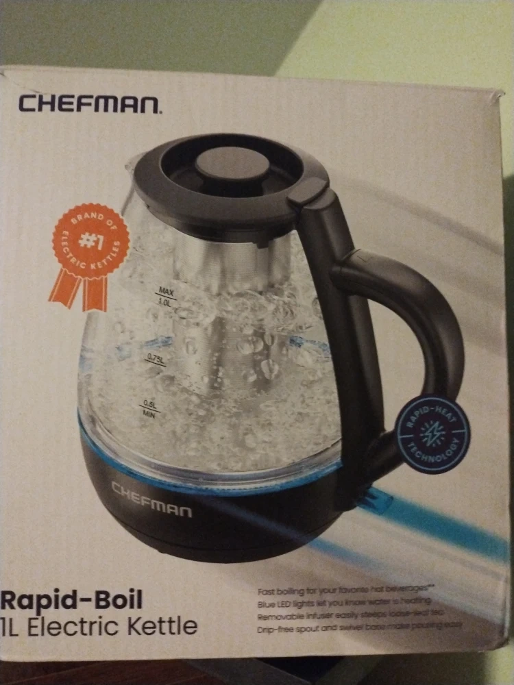 I'm selling a Chefman Rapid-Boil 1L Electric Kettle. It has Rapid-Heat Technology. It is a #1 Brand of Electric Kettles. It features blue LED lights that let you know when water is heating. Also, it has a removable infuser that easily steeps loose-leaf tea. The kettle has a drip-free spout and swivel base making pouring easy