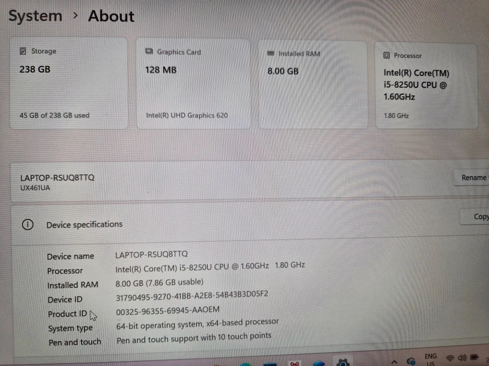 Selling an Asus Zenbook Flip laptop! It has 256GB SSD and 8.00 GB RAM. The processor is an Intel(R) Core(TM) i5-8250U. Intel UHD Graphics 620 graphics. Please refer to picture for more info on spec. Touch screen. No games; only used for school/work, in a pretty good condition. Please give me a shout!