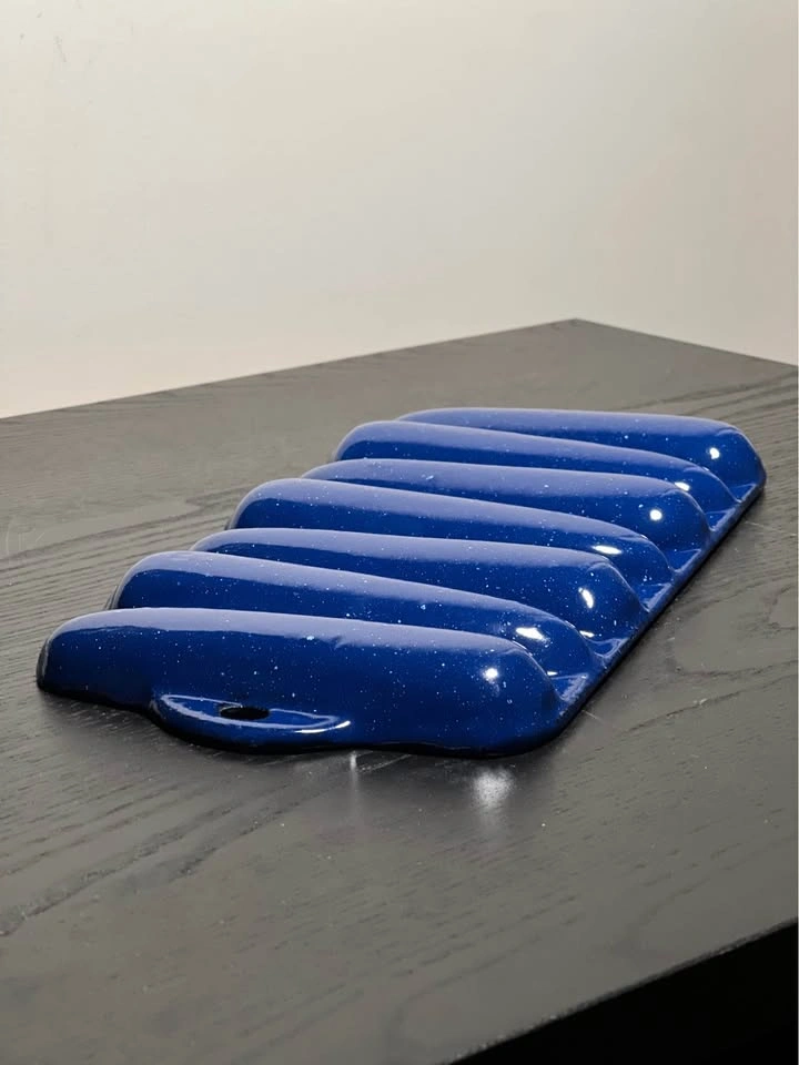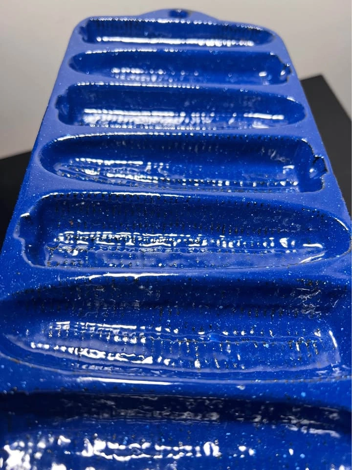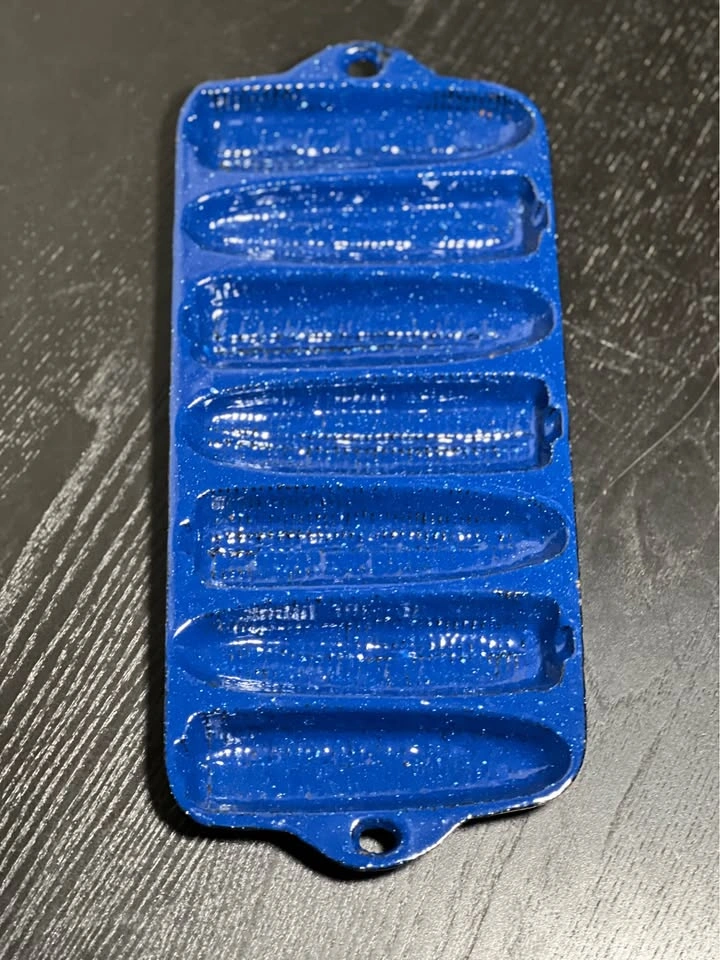 This item is a vintage Lodge blue enameled cast iron corn stick pan, designed for baking cornbread in the shape of miniature corn cobs.